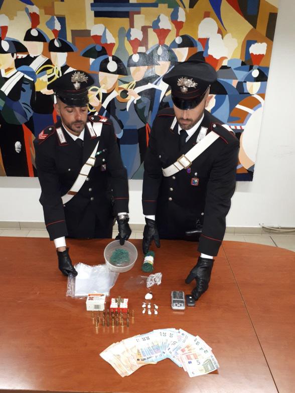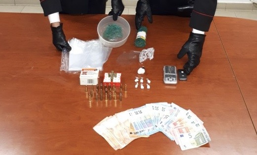 La perquisizione in casa ha consentito ai carabinieri di trovare 16 grammi di cocaina, 3,7 di marijuana, 23 proiettili calibro 357 magnum marca GFL con ogiva punta camiciata e 6 proiettili di una calibro 44 marca Winchester a punta piatta in piombo, ma anche bilancini di precisione, materiale per il confezionamento delle dosi e 1.045 euro in contante. Il materiale è stato sottoposto a sequestro e i due, ristretti ai domiciliari presso la propria abitazione in attesa del rito per direttissima.