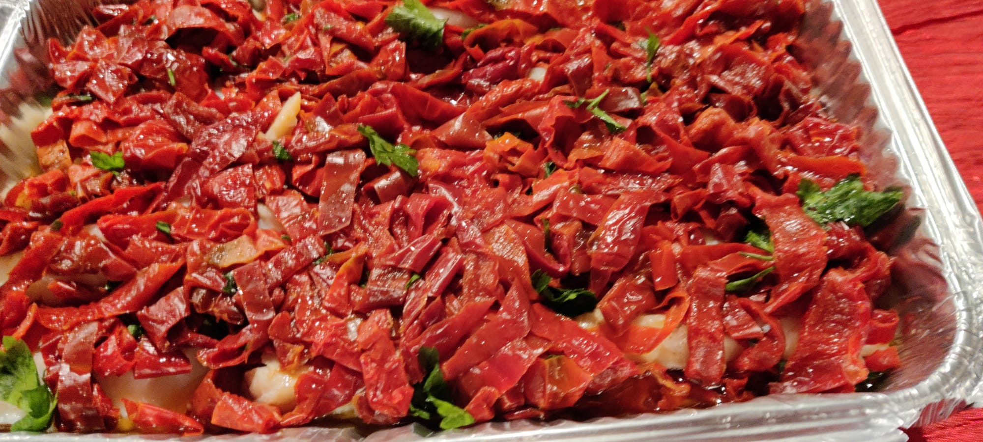 A trionfare uno dei grandi protagonisti della tradizione natalizia fondana, il Baccalà, condito con peperoni essiccati e olio locale.