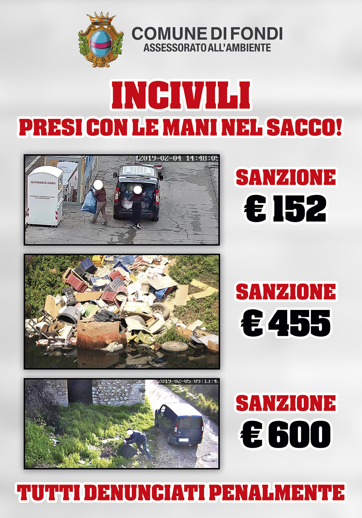 Contro l’abbandono indiscriminato dei rifiuti l’amministrazione comunale di Fondi ha lanciato una campagna di affissione e social “Incivili” con immagini degli scempi e dei luoghi destinati al degrado per conferimenti scellerati: “L’obiettivo è richiamare l’attenzione di chi le guarda e sensibilizzare al rispetto delle regole – ha fatto sapere il sindaco e il suo delegato all’Ambiente – con l’auspicio che la rappresentazione di questa sgradevole realtà faccia scattare la voglia di rispettare se stessi, il proprio ambiente e le altre persone e di comprendere la necessità di cambiare radicalmente i propri comportamenti”.