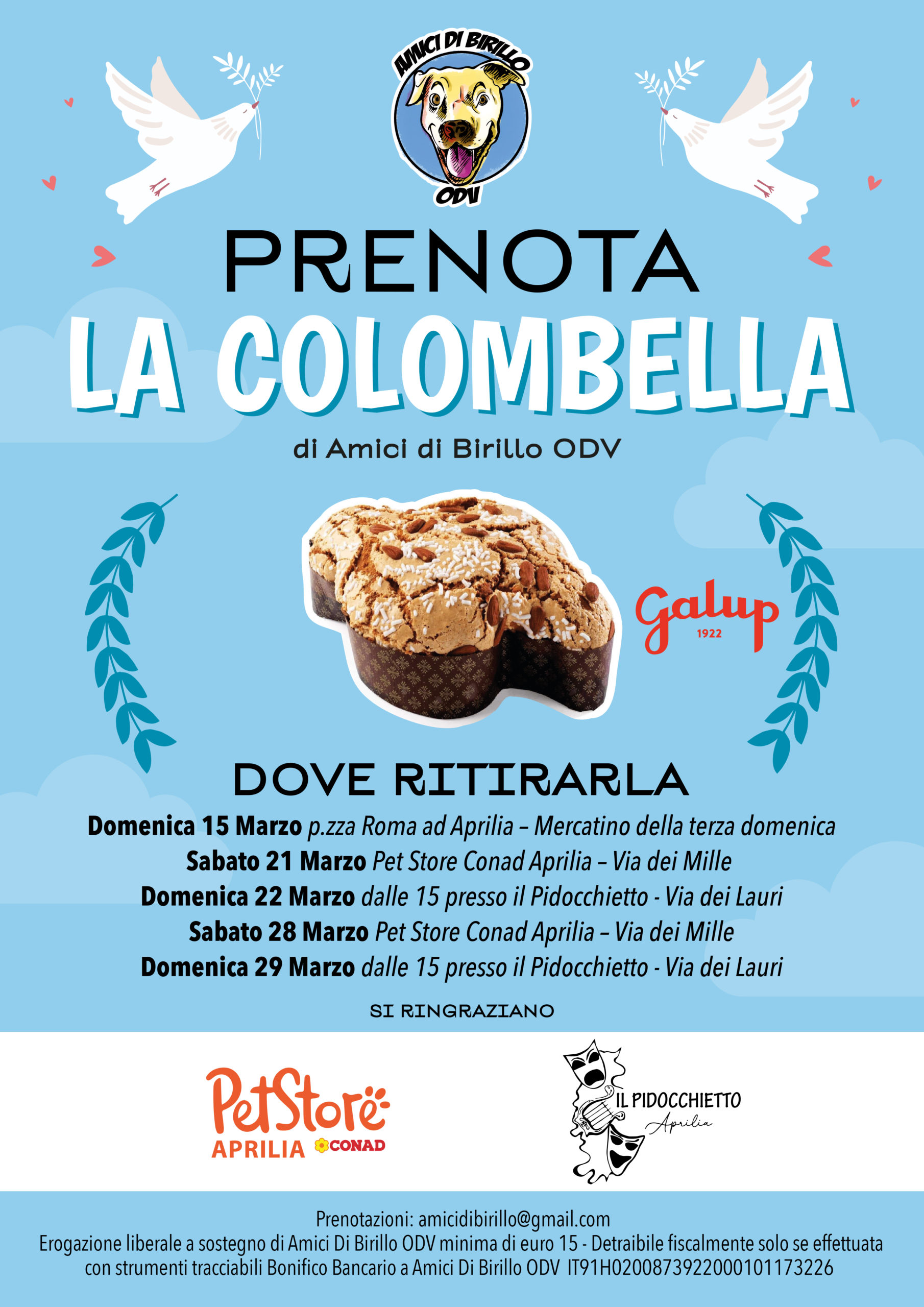 Per prenotare è necessario inviare una mail a amicidibirillo@gmail.com con oggetto “La Colombella”, allegando la ricevuta del bonifico; la richiesta sarà valida solo dopo la conferma dell’associazione. Il ritiro del prodotto potrà essere effettuato il 15 marzo in piazza Roma ad Aprilia, durante il mercatino della terza domenica, o il 21 e 28 marzo al Pet Store Conad di via dei Mille o, ancora, il 22 e 29 marzo al negozio “Il Pidocchietto” in via dei Lauri 19. Sarà comunque possibile acquistare il dolce anche senza prenotazione fino a esaurimento scorte.