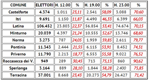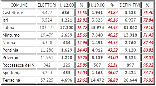 Lo scatto in avanti delle 19, in termini di affluenza alle urne, in provincia di Latina non è bastato a sanare la penalizzazione delle votazioni nella sola giornata di domenica. Alle 23 di oggi, tutti i dati definitivi nei dieci comuni chiamati al voto sono in calo rispetto alle precedenti elezioni. Latina ha perso 9 punti percentuali di affluenza: 70,15% contro 79.10% del 2011. Il dato pontino è comunque superiore alla media nazionale, pari al 65,89%.