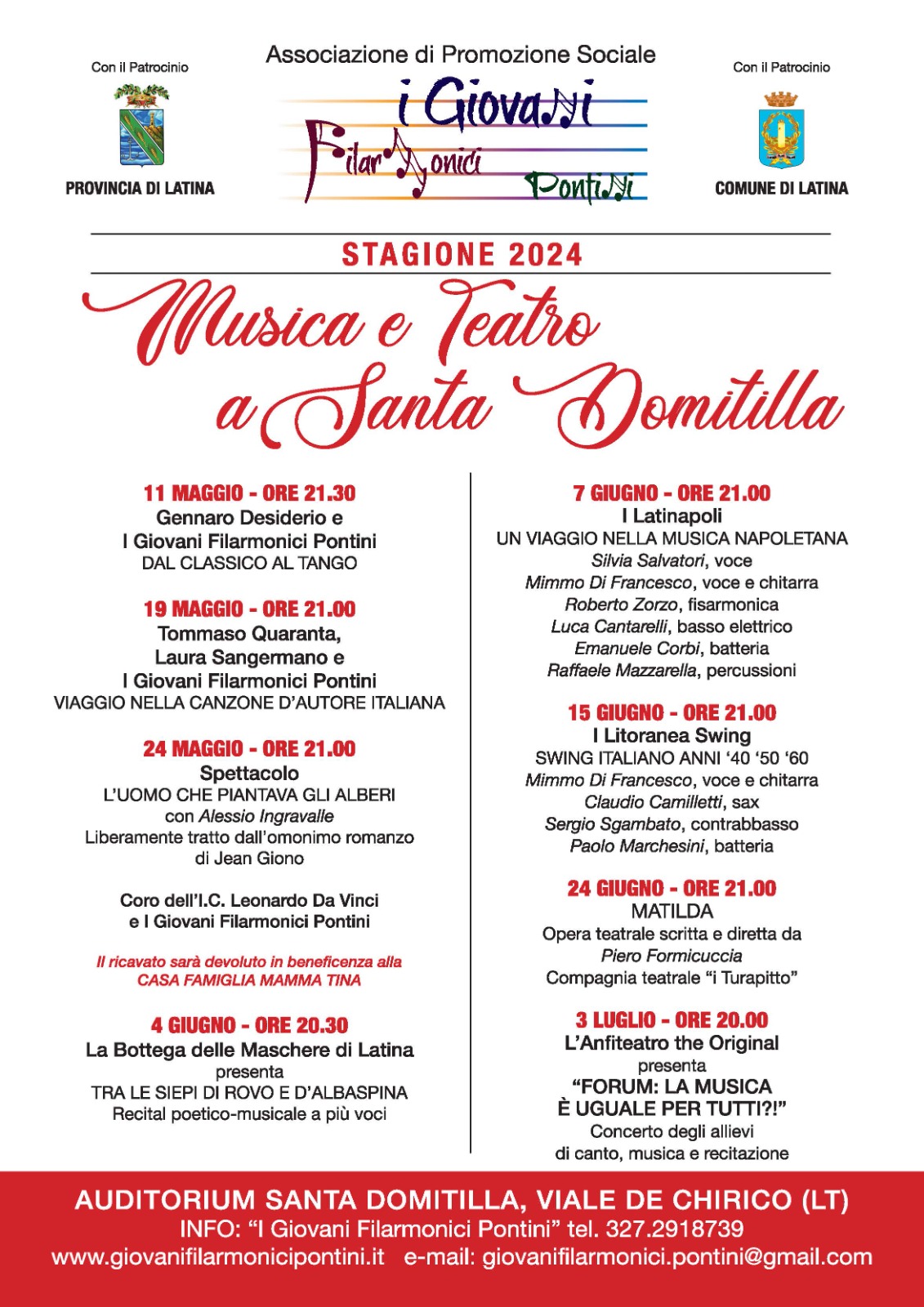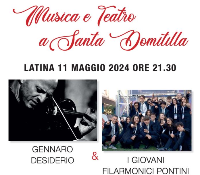 poi domenica 19 maggio con “Viaggio nella canzone d’autore italiana” quando ad esibirsi accompagnati da I Giovani Filarmonici Pontini ci saranno le splendide voci di Laura Sangermano e Tommaso Quaranta. Si chiuderà con una serata speciale la partecipazione dell’Orchestra dei Giovani Filarmonici Pontini, alla rassegna di Santa Domitilla, venerdì 24 Maggio, con lo spettacolo “L’Uomo che piantava gli alberi” con Alessio Ingravalle e il coro dell’Istituto Comprensivo Leonardo Da Vinci di Latina. Il ricavato della serata sarà devoluto alla casa famiglia Mamma Tina. A dare il via alla rassegna sarà quindi il Maestro Gennaro Desiderio, diplomato al prestigioso Conservatorio ‘San Pietro a Majella’ di Napoli, vincitore di numerosi premi musicali che suonerà insieme all’Orchestra dei Giovani Filarmonici Pontini, diretta dal Maestro Stefania Cimino, questo sabato 11 Maggio alle ore 21.30 all’Auditorium di Santa Domitilla a Latina, il concerto è patrocinato dalla Provincia e dal Comune di Latina. Gli altri spettacoli in cartellone di “Musica e Teatro a S. Domitilla 2024” sono: martedì 4 giugno con il recital “Tra le siepi di rovo e d’albaspina”; venerdì 7 giugno con “Un viaggio nella musica napoletana”; sabato 15 giugno con “Swing italiano anni ’40 – ’50 e ’60”; lunedì 24 giugno con lo spettacolo “Matilda” e mercoledì 3 Luglio con il concerto/spettacolo “Forum: la musica è uguale per tutti?!?”