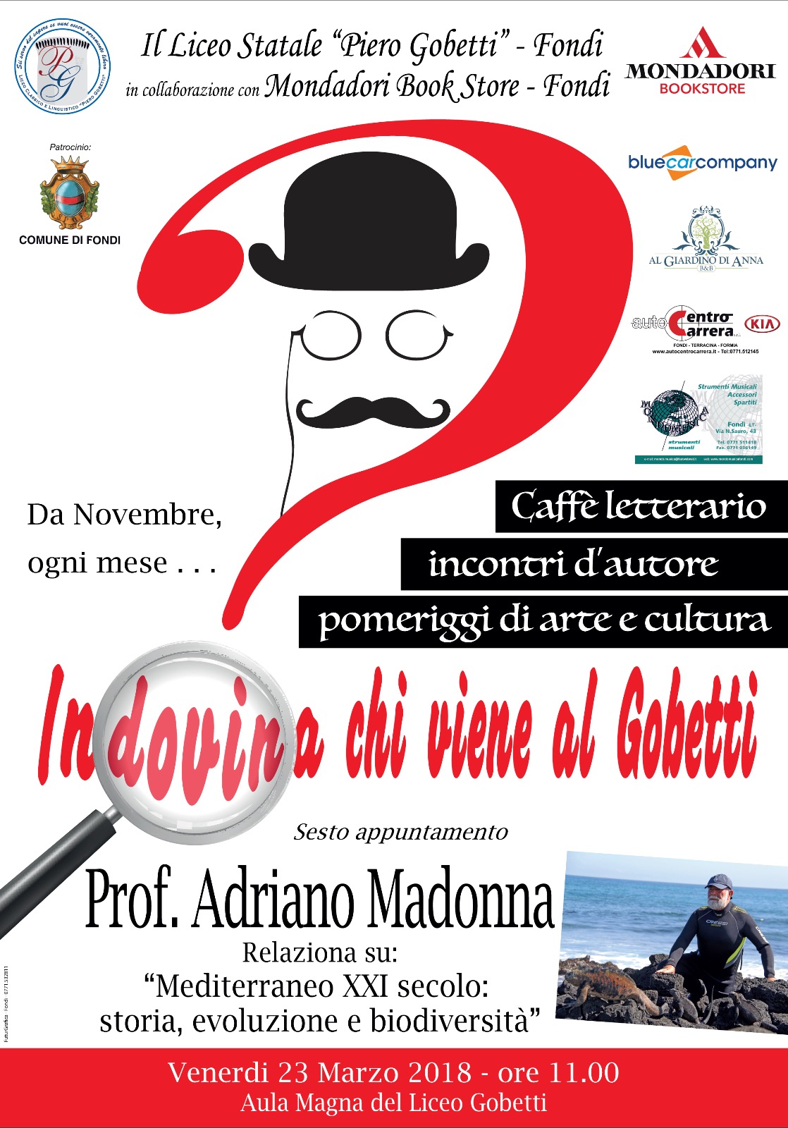 Venerdì 23 marzo alle 11 presso il Liceo “Piero Gobetti” di Fondi il professor Adriano Madonna, biologo marino, docente e ricercatore all’Università “Federico II” di Napoli noto per i suoi studi sui mutamenti climatici del Mediterraneo, sarà protagonista di un incontro sul tema “Mediterraneo XXI secolo: storia, evoluzione e biodiversità”. L’evento costituisce il sesto appuntamento organizzato dall’istituto in collaborazione con il Mondadori Book Store di Fondi nell’ambito della rassegna culturale “Indovina chi viene al Gobetti?” che ha preso il via lo scorso mese di novembre. Madonna ha lavorato come giornalista per quasi quarant’anni, ed è stato redattore della rivista specializzata “Il Subacqueo”. E’ sempre in giro per il mondo: il suo viaggio più recente lo ha portato per la seconda volta nelle Isole Galàpagos, dove ha avuto modo di osservare e studiare la colonia di pinguini che si è stabilita in quell’area: un caso straordinario di biodiversità e di evoluzione dovuto proprio ai cambiamenti climatici.