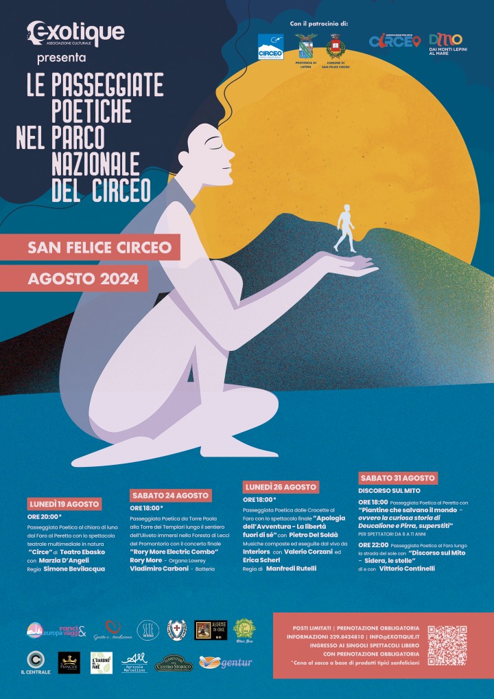 La manifestazione culturale ‘Le Passeggiate Poetiche nel Parco Nazionale del Circeo è giunta alla sua 14esima edizione. E’ stata ideata e realizzata dall’Associazione Exotique per promuovere e valorizzare il territorio del Circeo e le sue tradizioni, attraverso un cammino lento e il linguaggio delle arti performative, della musica, del teatro in natura e della prosa, per esaltare il patrimonio storico, naturalistico e culturale della zona.
