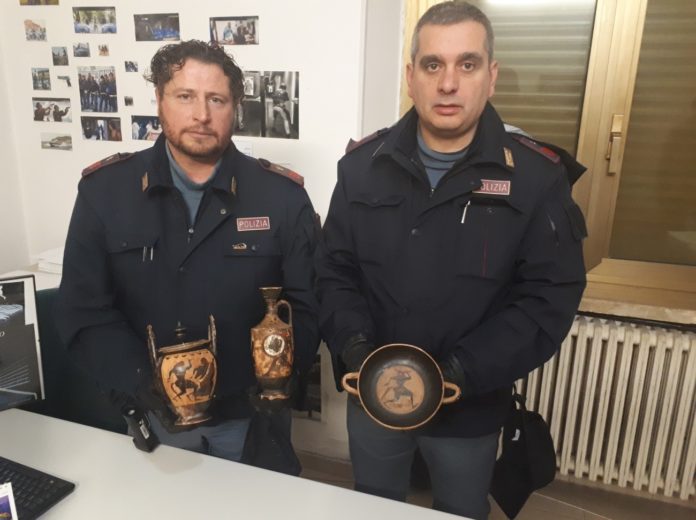 Sul posto, all’interno di ruderi abbandonati e solitamente frequentati da piccoli spacciatori, i poliziotti hanno effettuato diversi controlli e, proprio all’interno di uno di questi manufatti, è stata rinvenuta una busta in cellophane con all’interno dei reperti archeologici in buono stato di conservazione.