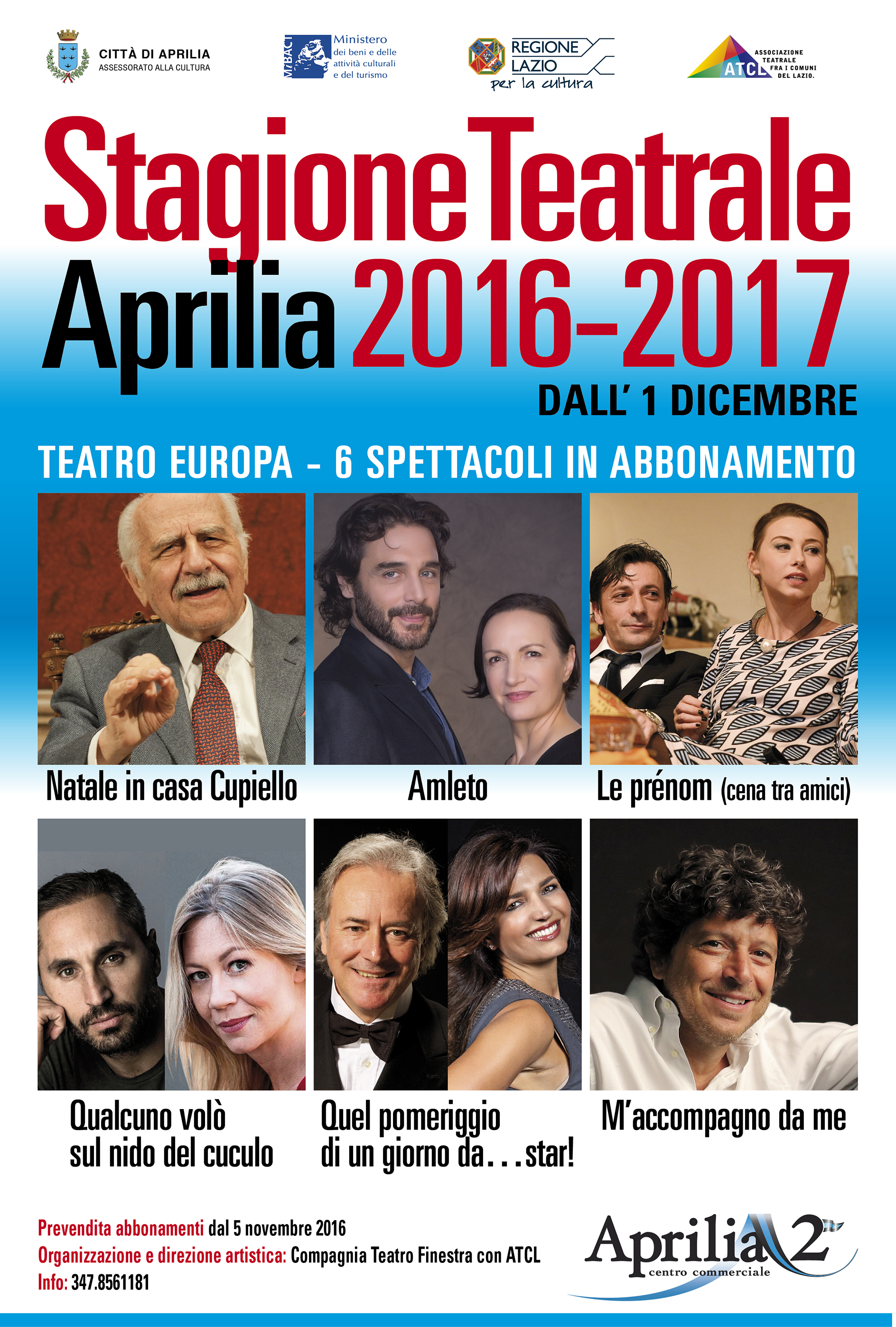 Una rassegna imperdibile per la stagione teatrale di Aprilia 2016-2017, con un’offerta che ha saputo coniugare teatro classico e le migliori commedie, per un cartellone di livello, dove non mancano grandi nomi. La rassegna teatrale, ufficializzata oggi in conferenza stampa, avrà luogo presso il teatro Europa di Aprilia, promossa dall’amministrazione comunale e dall’Associazione Teatrale fra i Comuni del Lazio con il sostegno di Regione Lazio e Ministero per i Beni e le Attività Culturali, con Direzione Artistica e Organizzazione affidate alla Compagnia Teatro Finestra. Un ventaglio di 6 spettacoli di ottimo livello artistico, con nomi importanti nel contesto teatrale italiano: da Luigi De Filippo a Maddalena Crippa, da Daniele Pecci a Corrado Tedeschi, Tosca D’Aquino, Daniele Russo, Elisabetta Valgoi, Michele La Ginestra. Una programmazione che spazia dal teatro classico a quello contemporaneo, con molti spettacoli di assoluto divertimento. Prezzi molto contenuti, accessibili a tutti, con riduzioni su abbonamenti e biglietti per associazioni, giovani e over 65. Si comincia Giovedì 1 dicembre 2016 con un classico d’autore, “Natale in casa Cupiello”. Abbonamenti in vendita dal 5 novembre al botteghino del Teatro Europa (pagamento anche con bancomat e carta di credito). Info: Compagnia Teatro Finestra 347.8561181 info@teatrofinestra.it Teatro Europa 06.97650344 (nel periodo delle feste botteghino aperto anche la domenica).