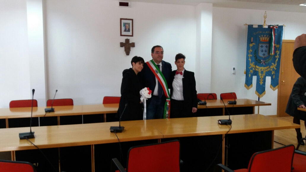Hanno pronunciato il fatidico si, davanti ad amici e parenti emozionatissimi, tutti radunati all’interno dell’aula consiliare della ex Claudia. La prima unione civile tra due donne è stata celebrata questa mattina dal sindaco Antonio Terra. A unirsi Sara Castellucci e Tania Gubinelli, due ragazze residenti nel Comune di Aprilia, classe 1981 e 1978, che oggi finalmente, dopo anni di attesa, hanno potuto coronare il loro sogno d’amore. “Siamo molto emozionate- hanno spiegato le ragazze al termine della crimonia- da molto tempo avremmo voluto fare questo passo, ma prima non era possibile. A gennaio abbiamo chiesto di iscriverci al registro e appena è passata la legge abbiamo presentato richiesta”. Quella celebrata ieri è stata la seconda unione civile per la città, la prima celebrata tra due donne di Aprilia. Dopo aver approvato la mozione presentata dal consigliere di Primavera Apriliana Carmen Porcelli, il consiglio comunale di Aprilia è stato tra i primi ad appovare il regolamento per il riconoscimento delle Unioni civili, il 18 dicembre 2014, due anni prima dell’approvazione della legge, votato solo da 14 consiglieri comunali tra maggioranza e opposizione. Il centrodestra infatti decise di uscire dall’aula prima del voto, mentre alla seduta risultavano assenti tra gli altri i consiglieri di maggioranza della lista L’altra Faccia della Politica Angelo Zanlucchi e Renzo Caissutti. Il regolamento, presentato dopo la mozione del consigliere Porcelli, era stato accolto positivamente dai consiglieri di maggioranza Luana Caporaso e Michela Biolcati.