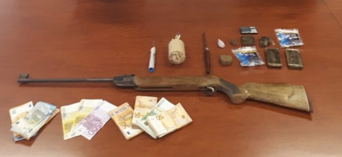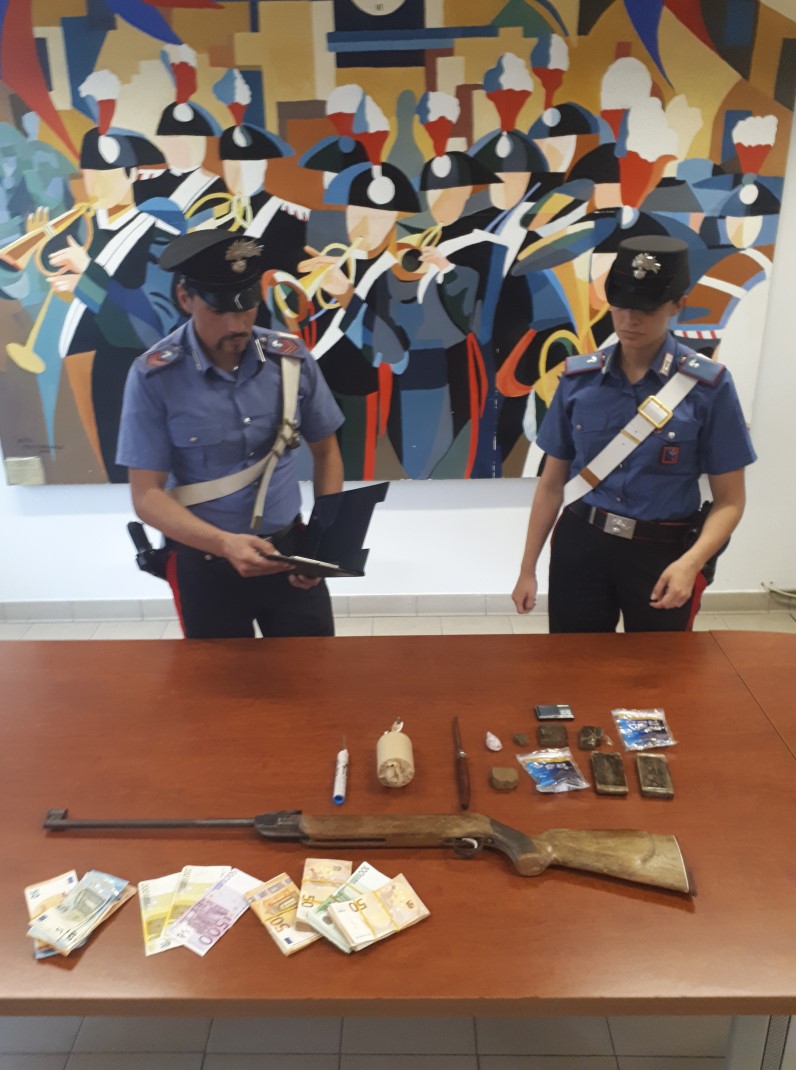 Nella sua abitazione i carabinieri hanno rinvenuto quattro etti di hashish e materiale per il confezionamento, una bomba carta e un candelotto pirotecnico di genere vietato, una carabina sprovvista di matricola, la somma contanti di 15.000 euro. Abbastanza per essere tradotto nella casa circondariale di Latina.