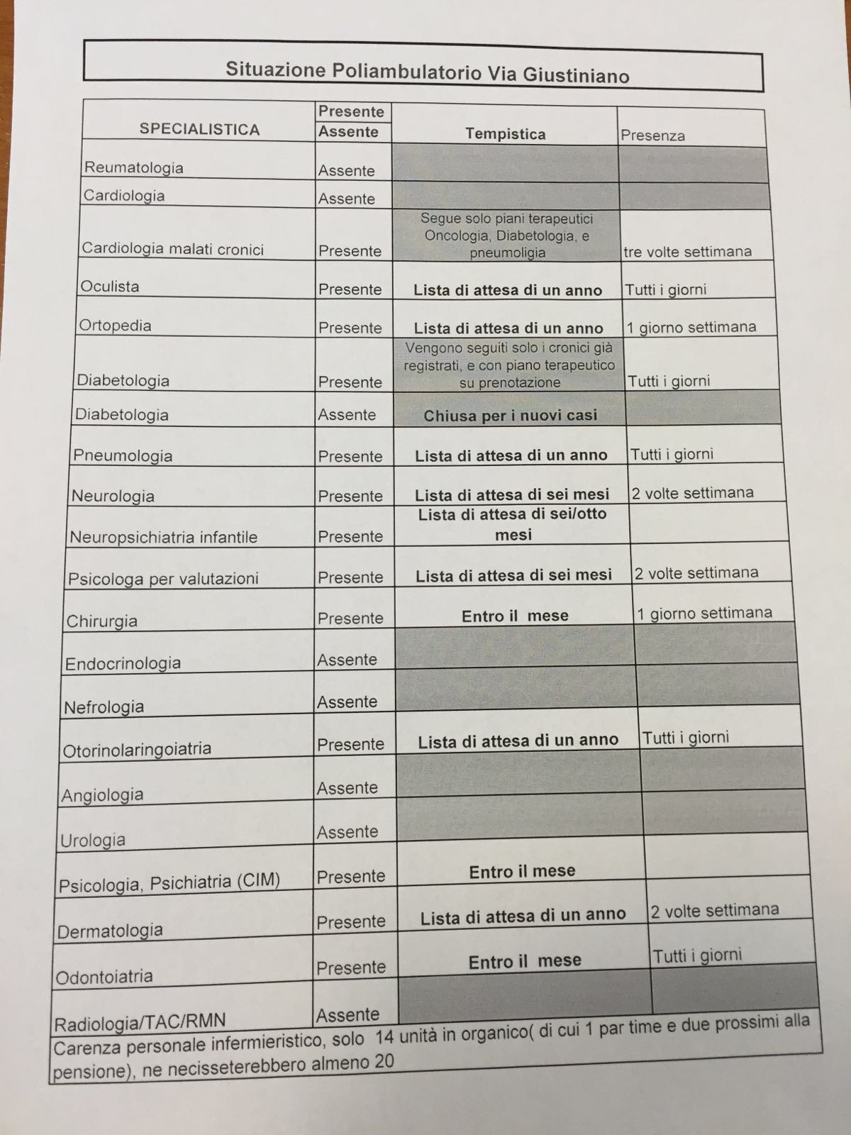 Una situazione drammatica quella del Distretto 1, che copre i comuni di Aprilia, Cisterna, Cori e Rocca Massima, dove il cardiologo manca e gli infermieri, sempre di meno, sono costretti a dividersi tra i servizi specialistiche ancora erogati. Ancora manca uno psicologo al consultorio e al dipartimento di neuropsichiatria infantile, mentre il servizio prelievi è stato sospeso il sabato per l’assenza di personale. “Manca anche la prevenzione- prosegue Frollano- eppure ciò permetterebbe di far risparmiare milioni e faciliterebbe la vita a migliaia di persone. Ormai ad occuparsi di prevenzione sono solo associazioni di volontariato, come la lodevole iniziativa promossa dal Comito di quartiere Grattacielo e dalla Croce Rossa per il controllo della glicemia. Cari amministratori, ci volete dare una mano? È vero che a fine anno aprirà la Casa della salute, ma di fatto nessuno sa con esattezza quali benefici porterà ai cittadini in termini di servizi”.