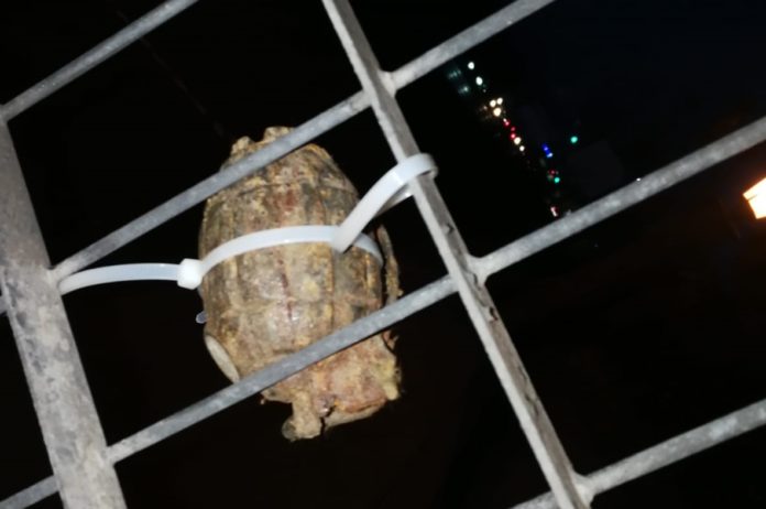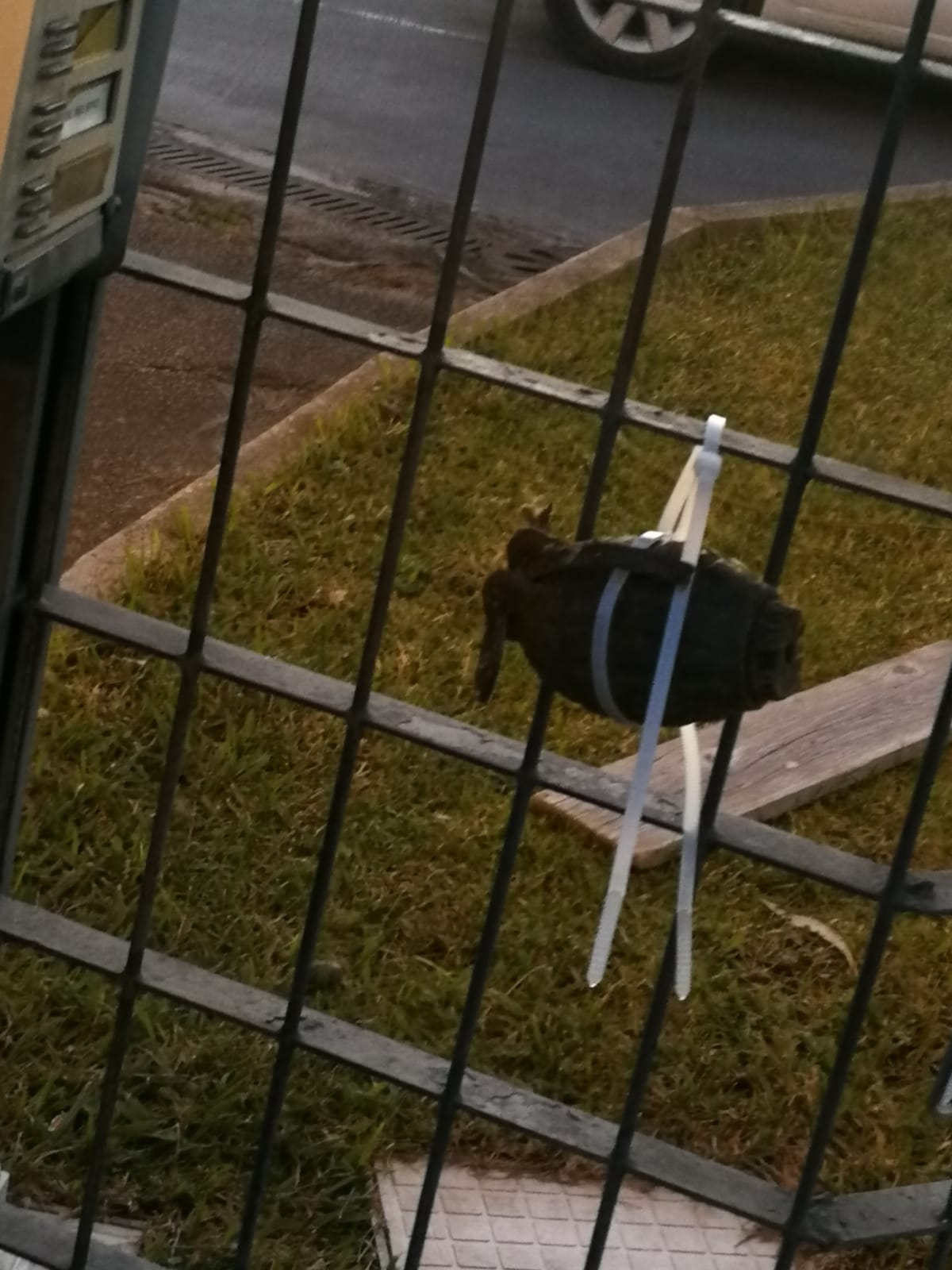 Bomba a mano rinvenuta questa sera ad Aprilia, sul cancello esterno della Tesei bus. Sul posto, in via Nettunense, sono intervenuti i carabinieri.