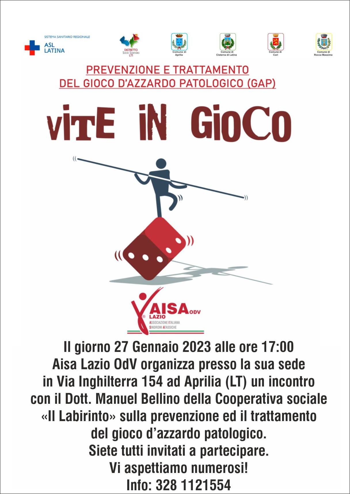 Oggi alle ore 17:00 Aisa Lazio Odv organizza presso la sua sede di via Inghilterra 154 ad Aprilia un incontro, del progetto distrettuale “Vite in gioco”, con il dottor Manuel Bellino della Cooperativa sociale “Il labirinto” sulla prevenzione ed il trattamento del gioco d’azzardo patologico.