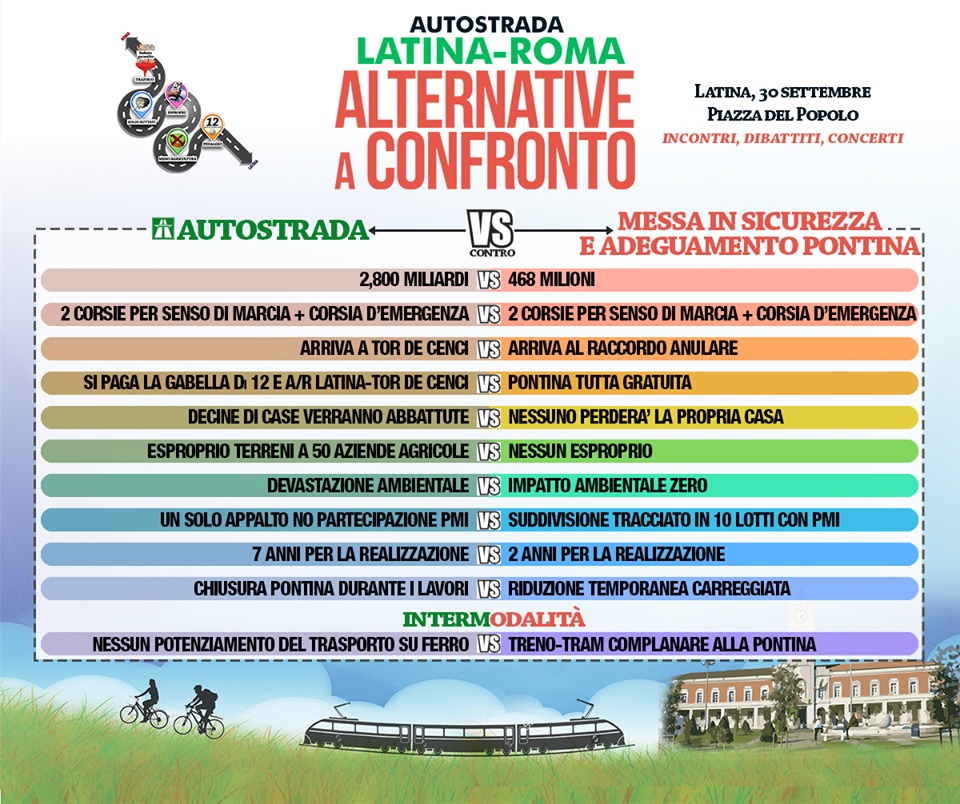 Oggi, 30 settembre, a Latina le ragioni del “no” all’autostrada A12-Roma-Latina e alla bretella Cisterna-Valmontone. Prenderanno inizio alle 16 le iniziative organizzate dai comitati “No corridoio Roma-Latina” e “No bretella Cisterna-Valmontone” per denunciare le criticità dei due progetti e per illustrare le proposte alternative “di buon senso, contro l’inutile, devastante e costosa autostrada/bretella a pedaggio”.