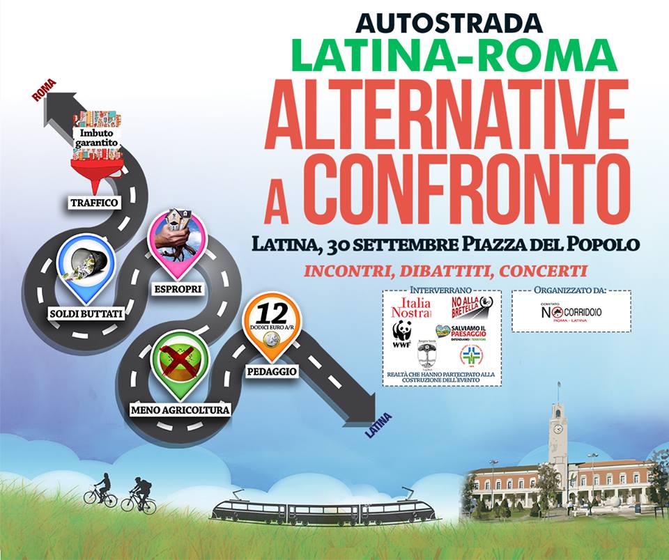 Oggi, 30 settembre, a Latina le ragioni del “no” all’autostrada A12-Roma-Latina e alla bretella Cisterna-Valmontone. Prenderanno inizio alle 16 le iniziative organizzate dai comitati “No corridoio Roma-Latina” e “No bretella Cisterna-Valmontone” per denunciare le criticità dei due progetti e per illustrare le proposte alternative “di buon senso, contro l’inutile, devastante e costosa autostrada/bretella a pedaggio”.