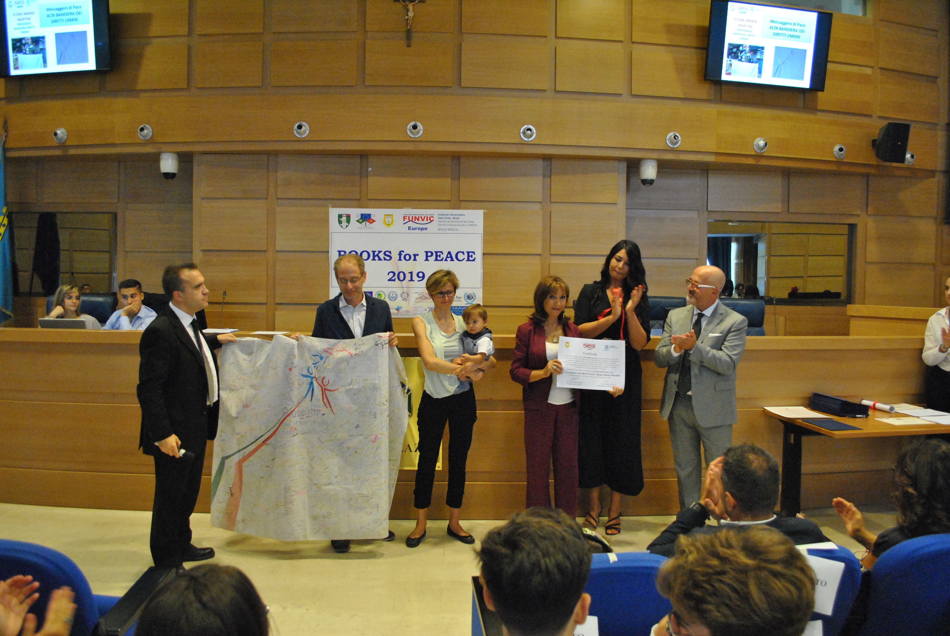 “Il Premio ‘Books for Peace’ è un ringraziamento ed un riconoscimento a tutti coloro che promuovono la cultura, la pace, la solidarietà, il dialogo interreligioso, i diritti umani, la tutela dell’ambiente, contro i pregiudizi culturali quali la violenza di genere, il razzismo, il bullismo. Nell’occasione sono state premiate personalità del mondo sociale che si sono distinte in questi campi ed i vincitori del concorso letterario”, hanno precisato Alessandro Marchetti, presidente Anaspol e Antonio Imeneo, direttore della Funvic Europa, coordinatori del Premio Books for Peace 2019.
