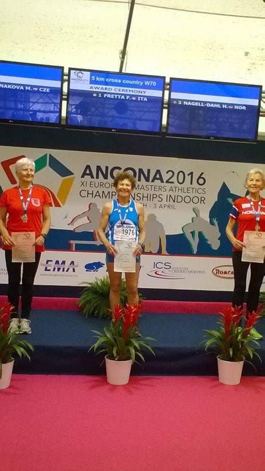 Nella prima giornata di gare della kermesse anconitana Fiorella Fretta, all’esordio nella categoria W70, si è cimentata nei 3000 metri mettendosi al collo un prezioso argento, arrivando così dietro la britannica Patricia Gallagher, e superando l’atleta della Repubblica Ceca Miloslava Rocnakova. Già tre anni fa l’italiana aveva ottenuto lo stesso risultato nell’europeo a San Sebastian, nella categoria W65, quando un infortunio in gara sembrava essere vicino a porre fine ai suoi sogni di gloria. Invece, dopo la precauzionale rinuncia agli 800 metri – che in terra spagnola le valsero il bronzo – e grazie ad un prodigioso recupero anche per merito dello staff medico che l’ha assistita, Fiorella Fretta si è presentata regolarmente al via dei 1500 metri, aggiudicandosi un’altra piazza d’onore tra le due britanniche, ancora la Gallagher e Iris Hornsey.