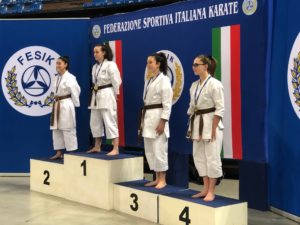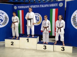 Subito dopo Alessia Mandatori bissava il podio del kata salendo sul terzo gradino della Coppa Italia. Alessia si trovava ad affrontare atlete fisicamente molto più grandi di lei, ma solo per statura, perché lo spirito di questa giovane karateka è da gigante e l’ha dimostrato sia nella vittoria che nella sconfitta, facendo battere il cuore a chi era dietro di lei e sugli spalti ad incoraggiarla.