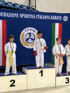 La domenica si svolgevano gli incontri del kumite individuale. Ad aprire le danze – per modo di dire – i più piccoli del gruppo inanellavano una vittoria dopo l’altra, con tutta l’energia e l’entusiasmo dei loro 9/10 anni. Nella stessa categoria, Matteo De Paola riusciva ad avanzare fino alla semifinale e a conquistare quindi la medaglia di bronzo del Campionato Italiano. Christian De Filippis cedeva un passo prima, ma aveva comunque la possibilità di disputare la Coppa Italia, gara parallela al campionato aperta ai quattro atleti che escono nei quarti di finale. Qui vinceva entrambi i combattimenti e si laureava quindi medaglia d’oro della Coppa Italia.
