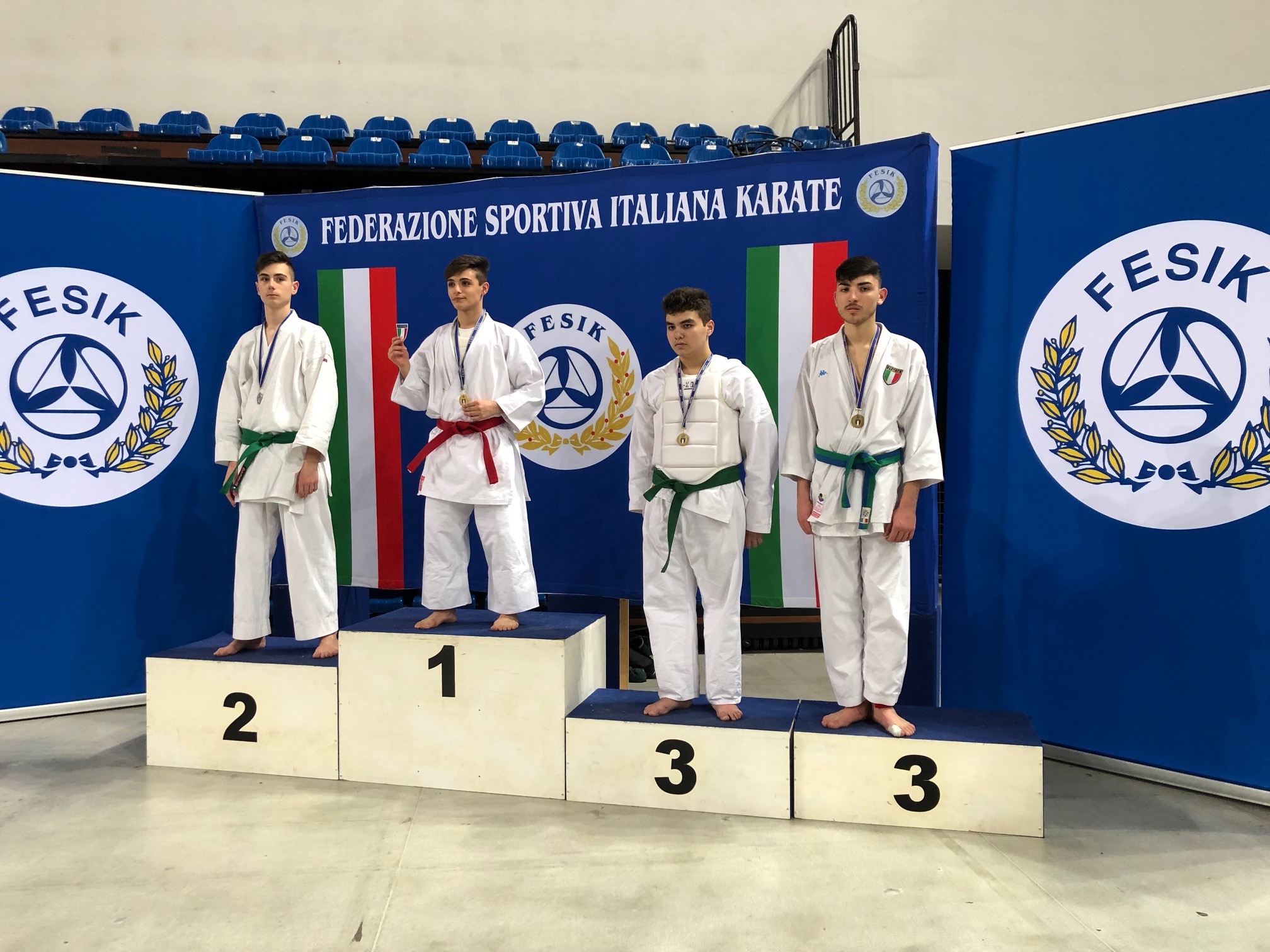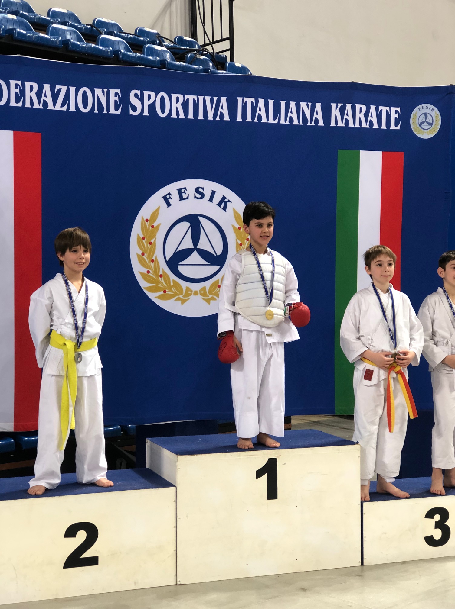 La domenica si svolgevano gli incontri del kumite individuale. Ad aprire le danze – per modo di dire – i più piccoli del gruppo inanellavano una vittoria dopo l’altra, con tutta l’energia e l’entusiasmo dei loro 9/10 anni. Nella stessa categoria, Matteo De Paola riusciva ad avanzare fino alla semifinale e a conquistare quindi la medaglia di bronzo del Campionato Italiano. Christian De Filippis cedeva un passo prima, ma aveva comunque la possibilità di disputare la Coppa Italia, gara parallela al campionato aperta ai quattro atleti che escono nei quarti di finale. Qui vinceva entrambi i combattimenti e si laureava quindi medaglia d’oro della Coppa Italia.