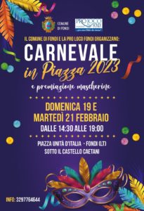 “Invitiamo grandi e piccini a partecipare numerosi – commentano il sindaco di Fondi Beniamino Maschietto e l’assessore alla Cultura e al Turismo Vincenzo Carnevale – sarà una festa semplice, pensata per il piacere di stare insieme e dedicata soprattutto ai bambini tra colori, musica, divertimento e, soprattutto, tante mascherine”.