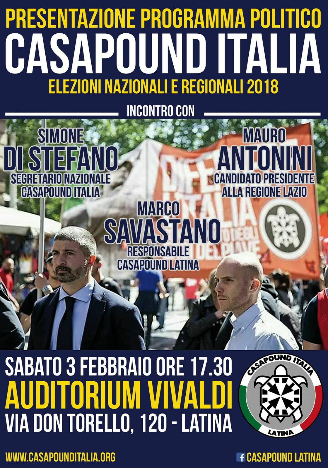 Dopo aver presentato i candidati alle elezioni regionali e politiche del 4 marzo continua la campagna elettorale di CasaPound Italia nel territorio pontino: sabato 3 febbraio a Latina, in Via Don Torello, presso l’Auditorium Vivaldi saranno presenti Simone Di Stefano, segretario di CasaPound e Mauro Antonini, candidato alla presidenza della Regione Lazio.