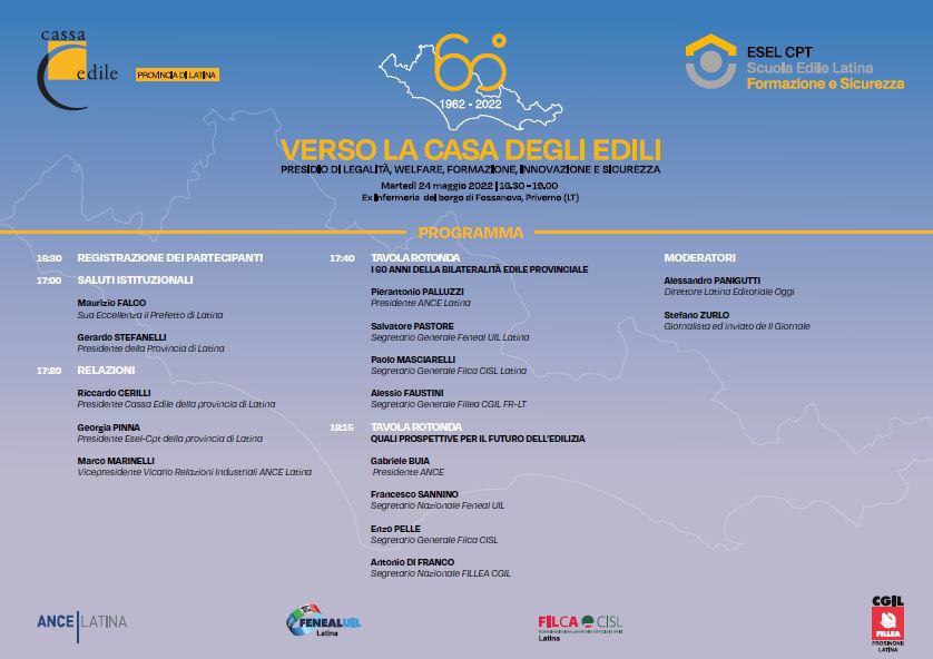 La Cassa Edile e la Scuola Edile (Esel Cpt) della provincia di Latina celebrano quest’anno i 60 anni di attività. Un traguardo importantissimo per il settore reso possibile dall’impegno dalle parti sociali che la guidano: Ance Latina, Feneal Uil Latina, Filca Cisl Latina e Fillea Cgil Frosinone-Latina. Per celebrare questo evento le parti sociali si sono date appuntamento il 24 maggio 2022 dalle ore 16.30 nell’antica infermeria del borgo di Fossanova a Priverno. All’incontro dal titolo “Verso la casa degli edili” interverranno, tra gli altri, il prefetto di Latina Maurizio Falco e il presidente della Provincia, Gerardo Stefanelli.