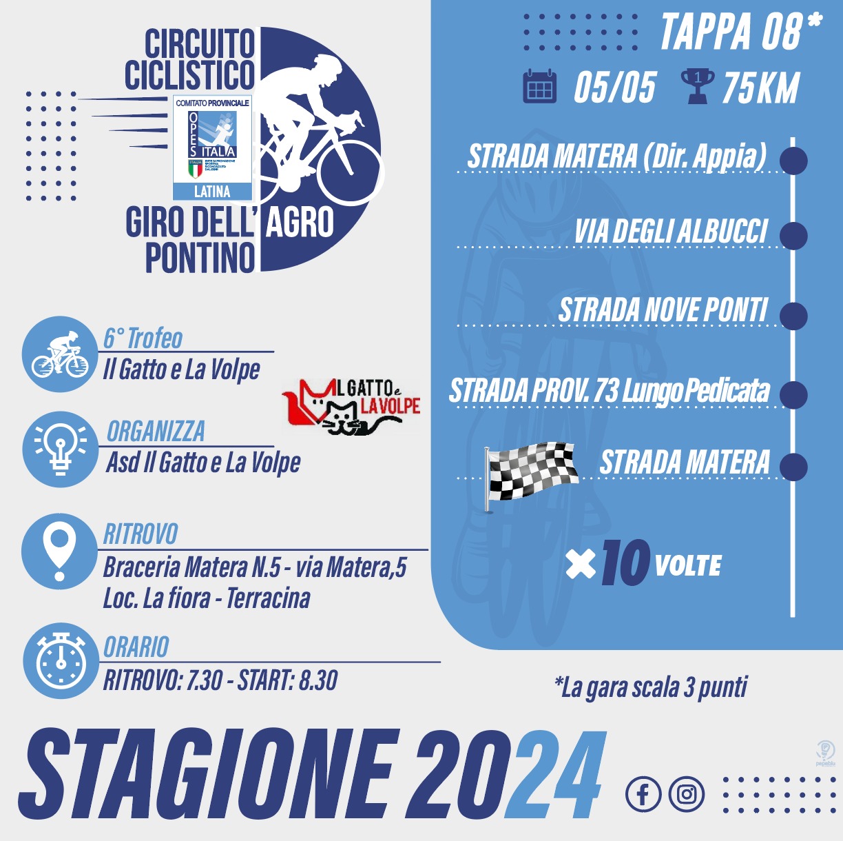 Per non perdere tutti gli sviluppi di gara è possibile seguire i canali social dedicati al Giro dell’Agro Pontino su opeslatina.it, su facebook ed instagram Opes Latina e Giro dell’Agro Pontino. Per maggiori informazioni scrivere a ilgirodellagropontino@gmail.com.