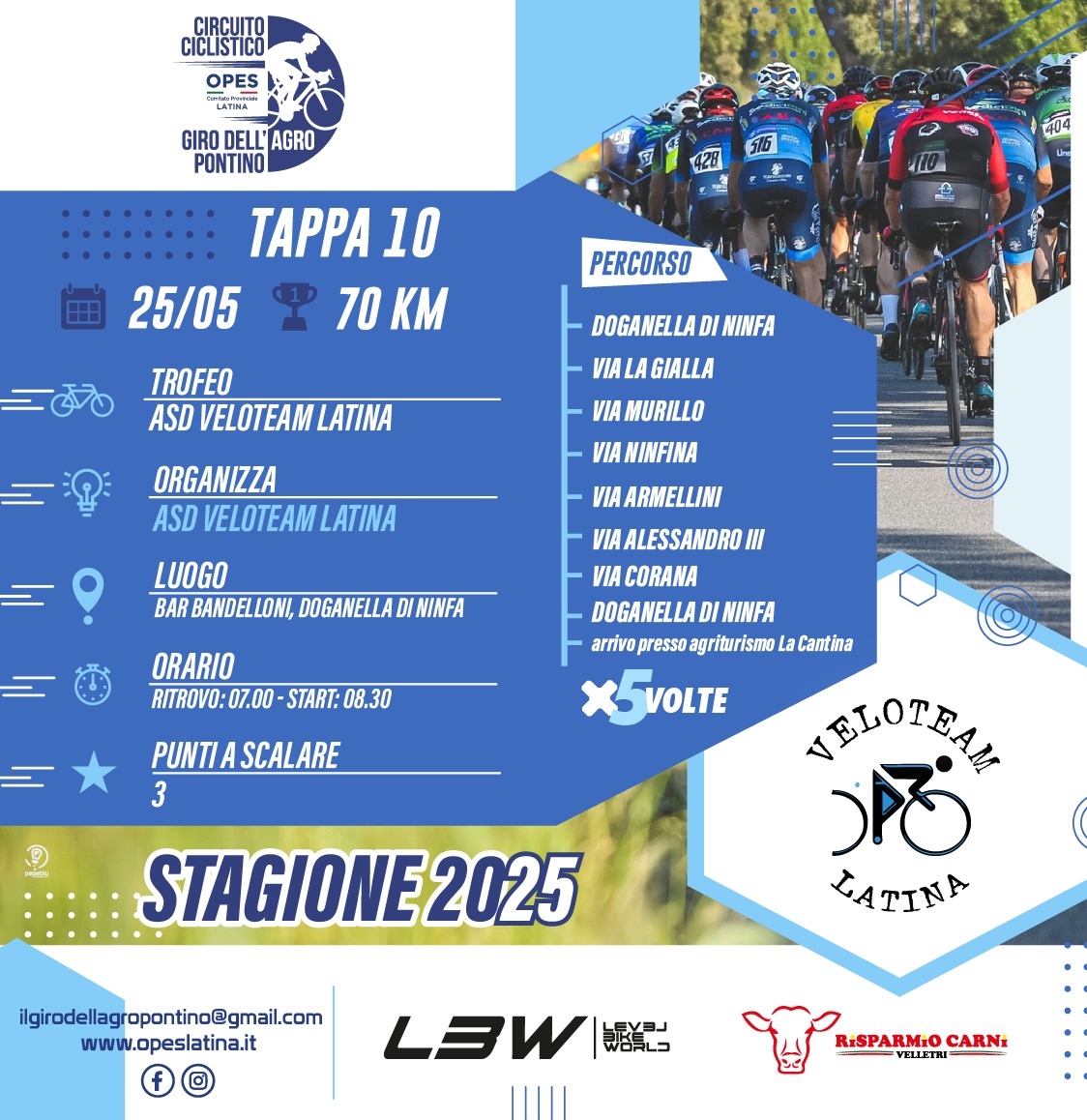 Domenica 25 maggio si terrà il Trofeo Asd Veloteam Latina. La tappa numero dieci del Giro Dell’Agro Pontino Opes sarà realizzata sotto l’organizzazione dell’omonima società asd Veloteam Latina. Gli atleti sono chiamati a radunarsi per le 7 presso il Bar Bandelloni a Doganella di Ninfa. La partenza sarà data alle 8.30. Per giungere al traguardo posto presso l’agriturismo “La Cantina”, si dovrà percorrere per cinque volte il tracciato di gara e nello specifico si partirà da Doganella Di Ninfa e si proseguirà per via La Gialla, via Murillo, via Ninfina, via Armellini , via Alessandro III , via Corana e rientro a Doganella Di Ninfa.