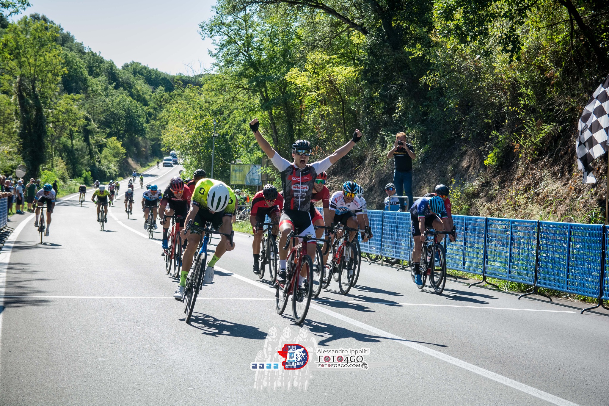 L’inizio della gara vedeva immediatamente avvantaggiarsi un gruppetto di 5 atleti: Leggeri, Orlacchio, Serangeli, Persichilli, Corsetti. Un’azione ben orchestrata che costringeva l’Asd Paco Team e l’Asd Il gatto & La Volpe ad effettuare un forcing per poter chiudere il gap all’inizio del terzo giro. Nello stesso giro, la parte alta del percorso molto ondulata, dava di nuovo il via ad altri 5 atleti: Strano Paniccia, Madaluni, Pantoni, Polidori, Gabrielli, su cui al termine della quarta ascesa si agganciavano in un primo momento Picozza e Giuliani, ed a stretto giro tutto il gruppo. L’alta velocità nella discesa finale non permetteva nessun attacco ma solo un arrivo a ranghi compatti che vedeva trionfare Alessio Strano Paniccia dell’USC Team Nrdecchia- Montini, su Pantoni Manuel del Team Center Bike e Gabrielli Marco dell’ASD BikeLab Team Astolfi.