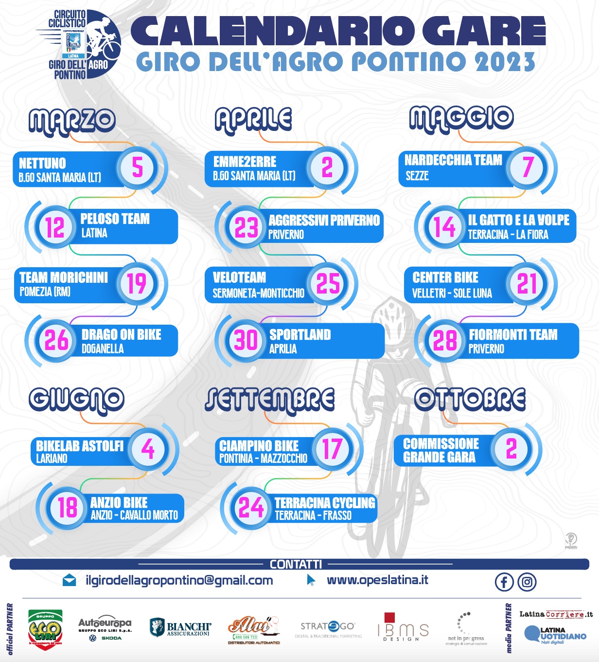 “5 marzo 2023, data da memorizzare e vicinissima in quanto aprirà le danze dell’edizione 2023 del Giro dell’Agro Pontino – commentano dalla Commissione Ciclistica Opes – Anche per questa nuova stagione abbiamo voluto lavorare sottovoce ma, speriamo, con estrema qualità, cercando di non tralasciare nulla al caso. Le oramai continue evoluzioni di codici e regolamenti per l’organizzazione di eventi, ci impongono un’attenzione particolare e moltissima professionalità da parte di tutta la macchina organizzativa per lo svolgimento del torneo. Stagione 2023 – spiegano – che almeno dai presupposti, si annuncia allineata a quanto fatto nel 2022. I numeri sono ancora con noi: 16 società, 250 iscritti al torneo, 17 gare in calendario, che toccheranno posti incredibili del nostro Agro Pontino, con qualche puntatina nelle vicine campagne romane. Grazie agli sponsor che continuano a seguirci, allo staff con la profusione costante del proprio impegno ed a tutte le società e gli atleti che continuano a darci fiducia e che a brevissimo sapranno regalare spettacolo sulle strade della nostra provincia”.