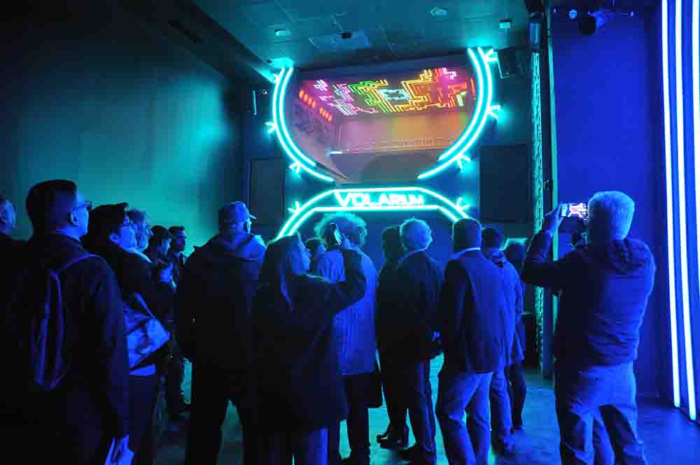 Un ascensore futuristico ci solleva fino al livello del cinema, una piattaforma elettro-idraulica (Motion Platform) che svetta nel grande teatro.