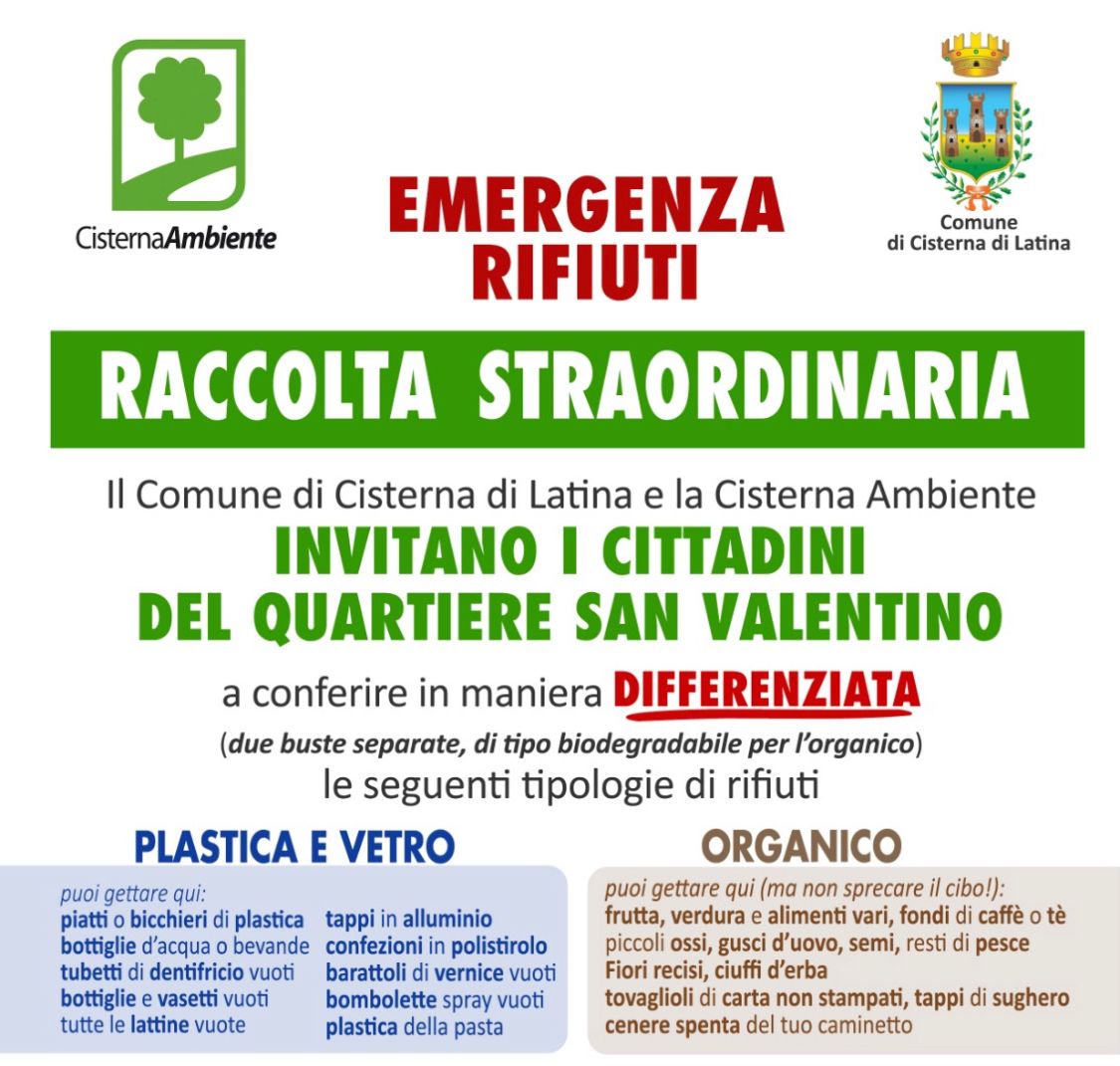 Per questo il Comune di Cisterna e la Cisterna Ambiente, al fine di ridurre la presenza di rifiuti in strada, hanno organizzato una raccolta differenziata straordinaria nel quartiere San Valentino.