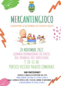 A Cisterna di Latina la giornata internazionale dei diritti dell’infanzia e dell’adolescenza si celebrerà giocando in modo solidale, di fatti domani 20 novembre dalle 09:30 alle 13.00 nell’atrio dell’ex palazzo comunale in Corso della Repubblica n.186, si terrà “Mercatingioco”, ovvero la cessione o scambio di giocattoli tra bambini e ragazzi di età compresa tra i sei e i quattordici anni accompagnati da un adulto.