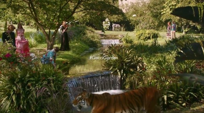 L’intero catalogo è ambientato all’interno del lussureggiante giardino di Ninfa che la maison ribattezza col nome di “Gucci Garden”, mentre la direzione dello spot video è stata affidata all’italo canadese Floria Sigismondi, artista nonché celebre regista di video musicali (Katy Perry, Christina Aguilera, David Bowie, Björk, Muse, Justin Timberlake, Marilyn Manson) e di pubblicità (Adidas, Samsung, Motorola, Old Navy, Eaton’s, MAC Cosmetics). Una visione, appunto, “paradisiaca” del giardino dove lungo gli argini del fiume e torrentelli dalle acque cristalline si muovono tigri, conigli, cavalli bianchi, serpenti e scene che evocano la tentazione tra Adamo ed Eva nel giardino dell’Eden.