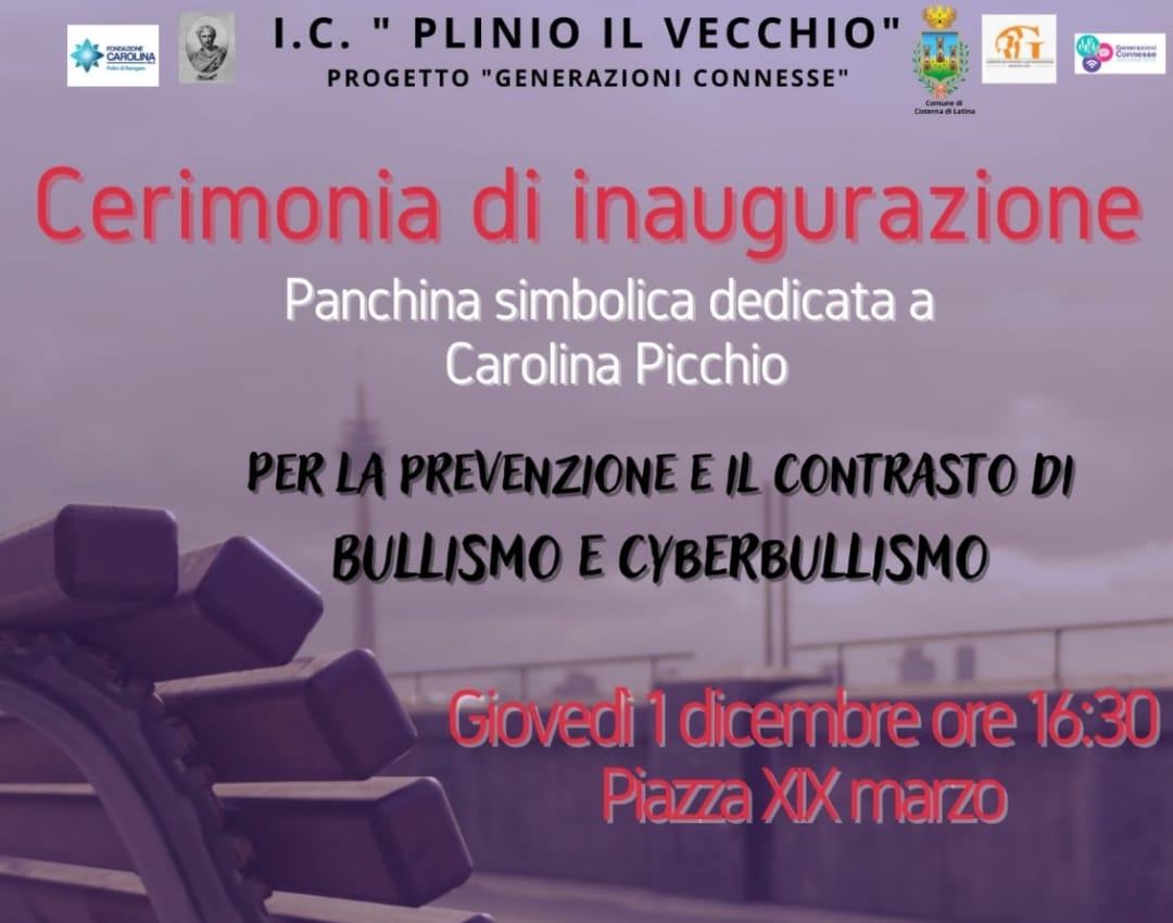 Alle ore 16.30 in Piazza XIX Marzo si terrà la cerimonia di inaugurazione della “panchina gialla”, simbolo della prevenzione e contrasto al bullismo e cyberbullismo, colorata dagli alunni della scuola secondaria di primo grado dell’Istituto Comprensivo Plinio il Vecchio, e dedicata a Carolina Picchio.