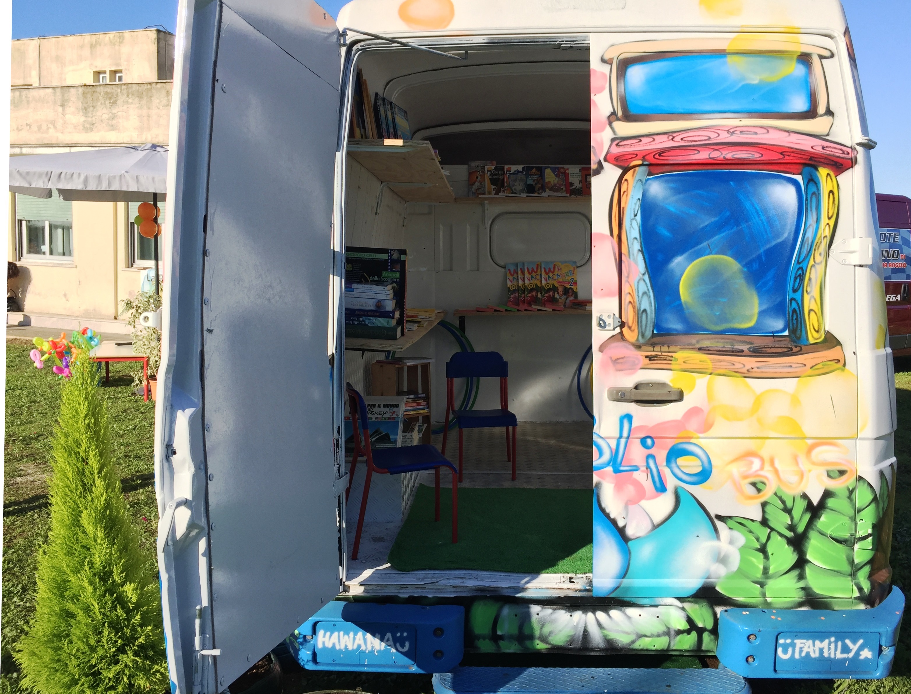 Un vecchio pulmino è diventato così una biblioteca a misura di bambino, allestita con estrema cura dei dettagli all’interno del giardino del plesso scolastico e decorata con l’opera dello street artist cisternese Morris.