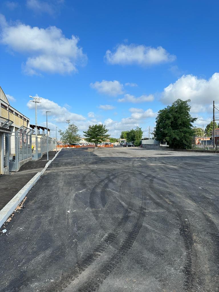 Questa mattina è stata realizzata la pavimentazione in asfalto della viabilità intorno all’edificio, dove già sono stati realizzati i marciapiedi con saliscendi per gli accessi e uscite dall’area del Palasport.Nell’ambito della viabilità sono previsti degli stalli per il parcheggio delle vetture che potranno essere usufruiti anche dagli utenti dei treni, facilmente raggiungibili grazie al sottopasso ferroviario.