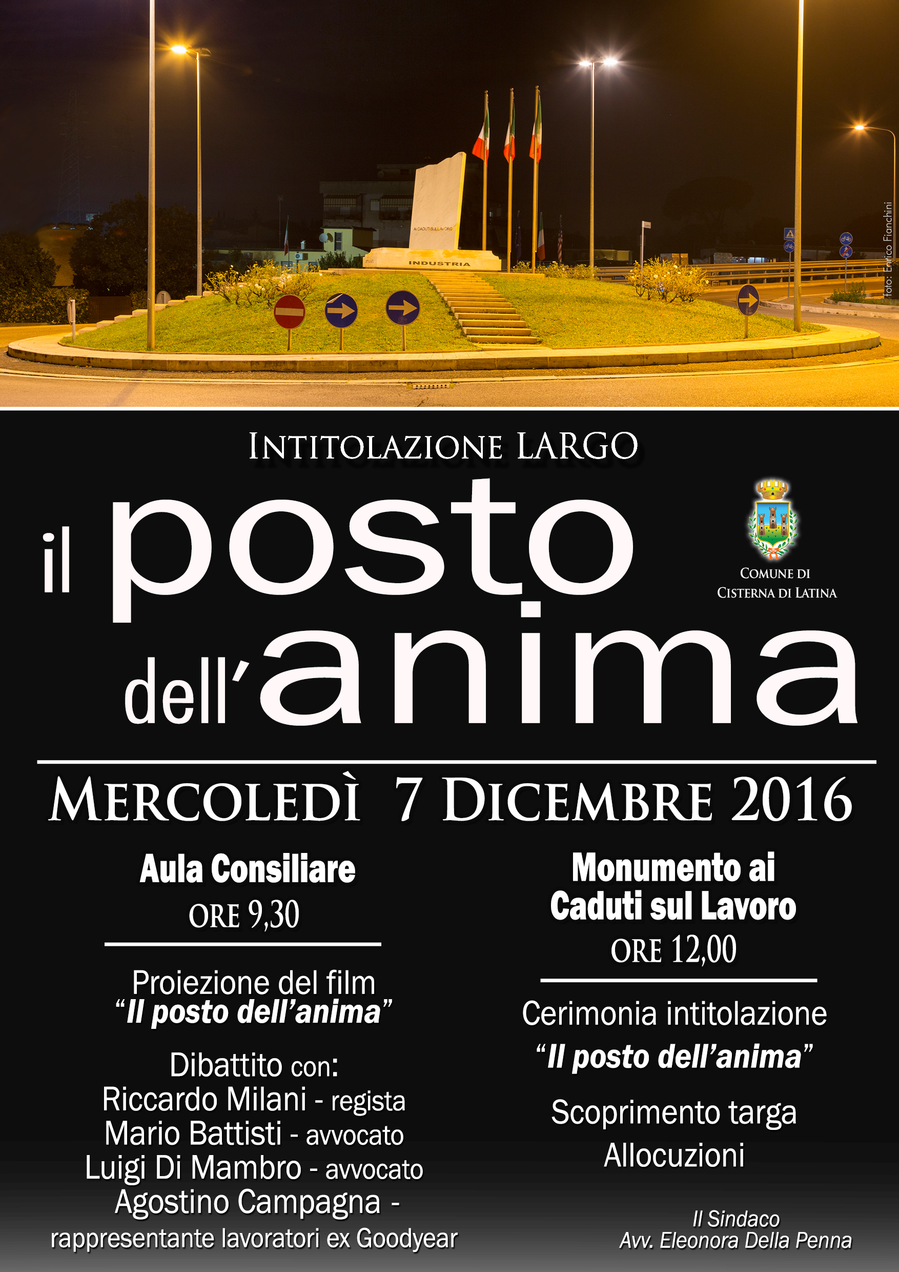 Mercoledì prossimo, 7 dicembre, l’area su cui sorge il Monumento ai Caduti sul Lavoro verrà intitolato “Il posto dell’anima”, proprio come il film diretto nel 2003 dal regista Riccardo Milani ispiratosi alla drammatica vicenda dello stabilimento ex Goodyear di Cisterna.
