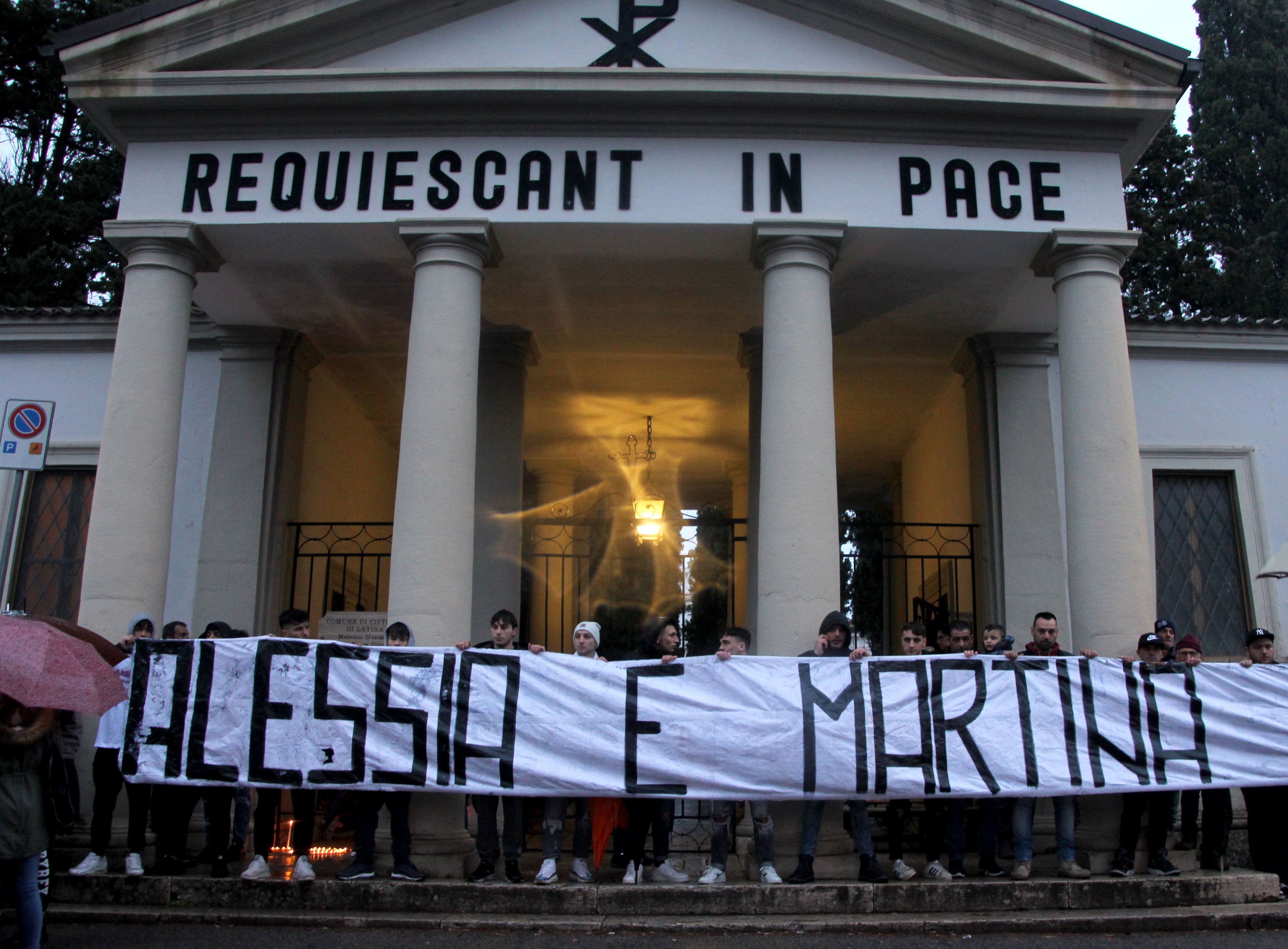 Qui, dinanzi alle finestre illuminate della camera mortuaria dove all’interno si trovano le due piccole bare bianche in attesa del funerale, sono stati esposti striscioni in onore di Alessia e Martina mentre il parroco don Patrizio ha invitato i presenti ad un minuto di raccoglimento e ad una preghiera.