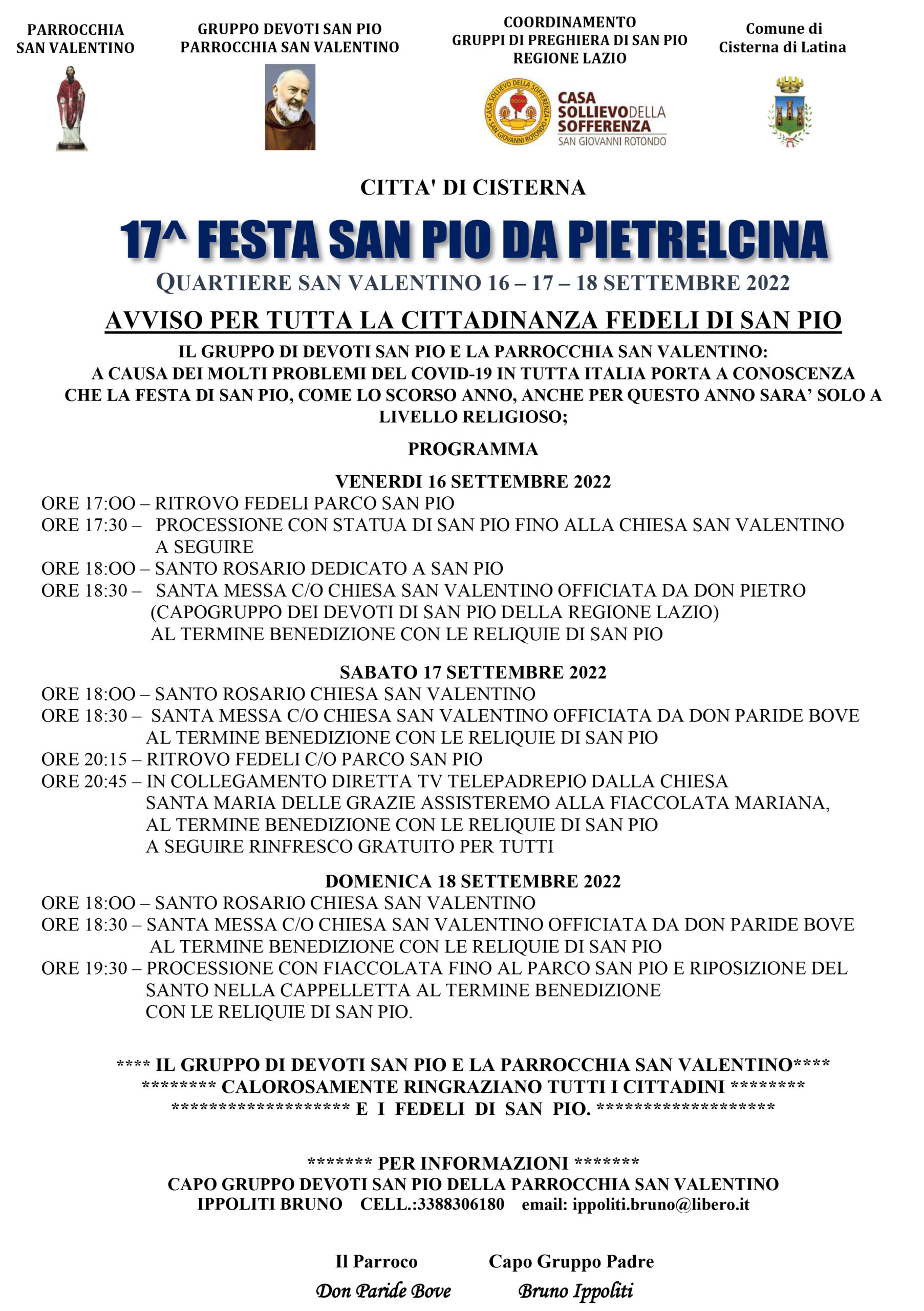 Appuntamento dunque venerdì alle ore 17:00 con il ritrovo dei fedeli nel parco San Pio, alle 17:30 partirà la processione con la statua di San Pio fino alla chiesa di San Valentino, a seguire si terranno il Santo Rosario dedicato a San Pio, e alle 18:30 la Santa Messa officiata da Don Pietro capogruppo dei Devoti di San Pio della regione Lazio, terminerà la giornata la benedizione con le reliquie di San Pio.Sabato, alle 18 i fedeli reciteranno il Santo Rosario all’interno della chiesa San Valentino e a seguire la Santa Messa officiata da don Paride Bove con la benedizione e le reliquie di San Pio.