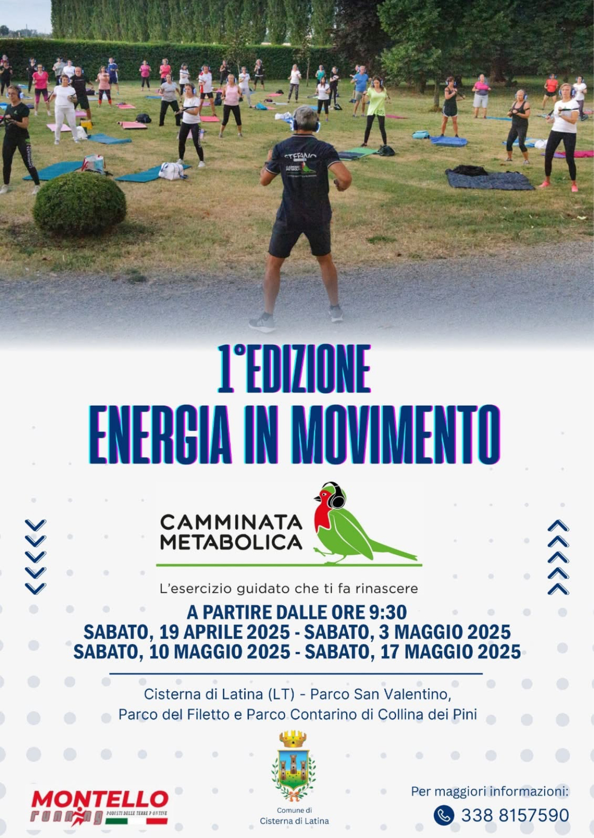 A Cisterna arriva una nuova iniziativa dedicata alla salute e al benessere: si chiama “Camminata Metabolica”, ed è un’attività ludico-motoria non agonistica articolata in quattro lezioni gratuite, organizzata dal comune in collaborazione con l’associazione Fitness Montello Running.