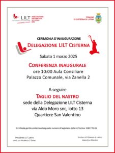 “Sono felice di annunciare che sabato 1° marzo verrà inaugurata la prima delegazione Lilt a Cisterna – commenta la Presidente della LILT Latina Nicoletta D’Erme – il nostro team di medici specialisti e volontari effettuerà visite di prevenzione primaria e accoglienza a tutti coloro i quali vorranno avvicinarsi alla nostra associazione”.