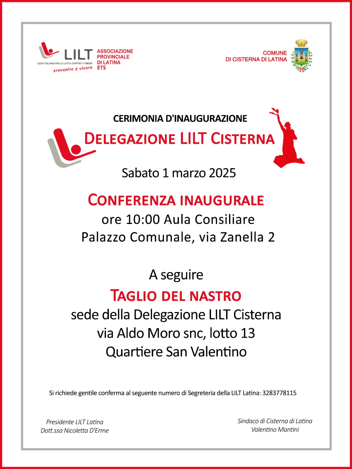 L’evento prevede due momenti: alle 10 si terrà la conferenza di presentazione nell’Aula consiliare del Palazzo Comunale, con la partecipazione della presidente provinciale della Lilt di Latina, Nicoletta D’Erme, del sindaco di Cisterna Valentino Mantini e della delegazione locale della Lilt; Alle 11:30, invece, seguirà il taglio del nastro nella nuova sede.