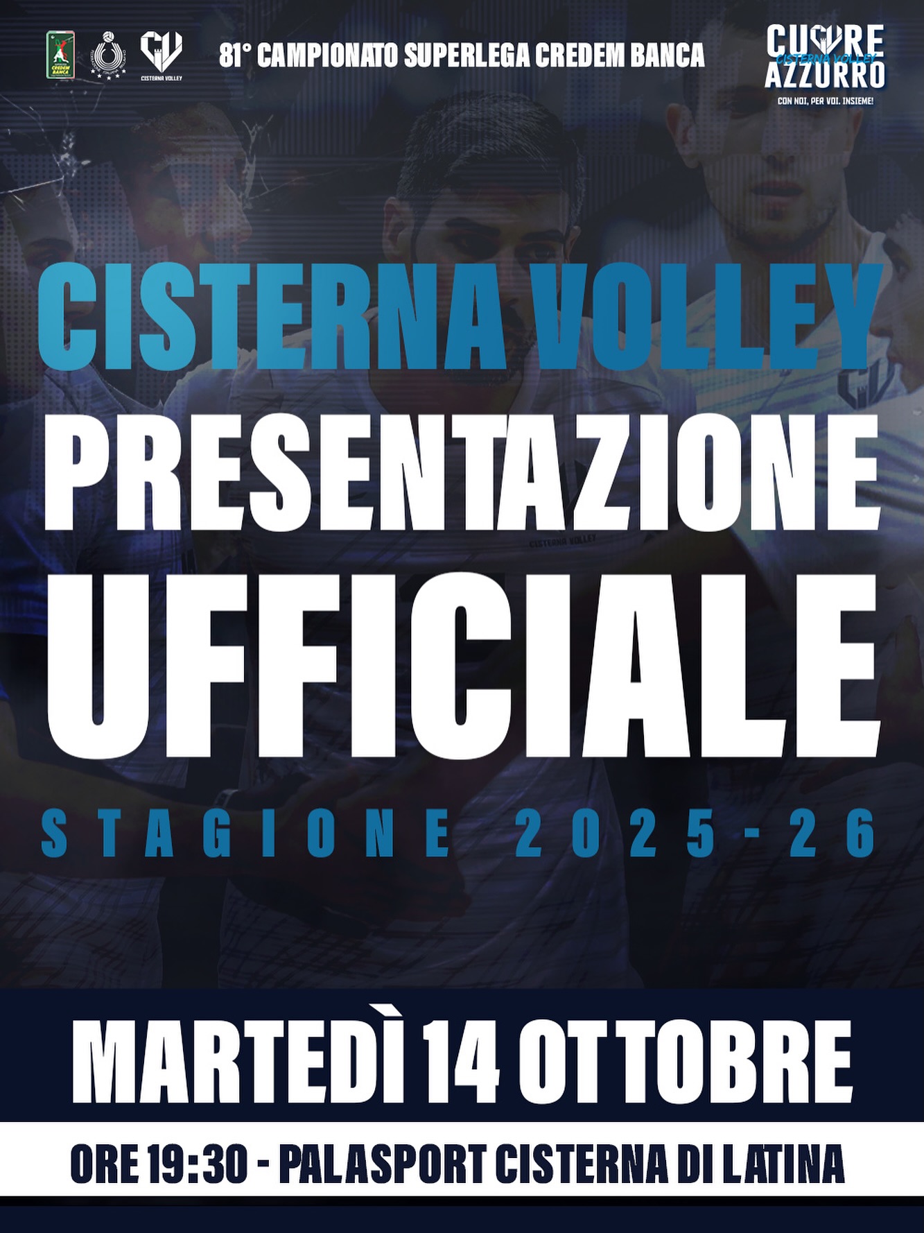 E’ partito il conto alla rovescia per l’inizio della nuova stagione di SuperLega Credem Banca e il Cisterna Volley è pronto a lanciare ufficialmente il proprio cammino nel massimo campionato nazionale di pallavolo. La presentazione ufficiale della squadra, dello staff e della nuova maglia si terrà martedì 14 ottobre alle ore 19.30 presso il Palasport di viale delle Province, casa del club e cuore pulsante del tifo biancoceleste.