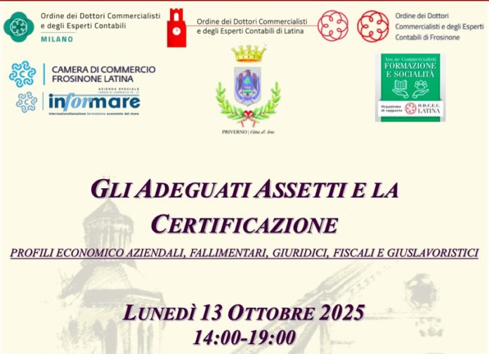 Lunedi prossimo, 13 ottobre, alle ore 14:00, presso l’Auditorium ex Infermeria dei Conversi in Fossanova – Priverno (all’interno del borgo e accanto alla abbazia) si svolgerà il convegno dal titolo “Gli adeguati assetti e la certificazione”, organizzato dall’Ordine di Dottori Commercialisti e degli Esperti Contabili (ODCEC) di Latina, Milano e Frosinone.