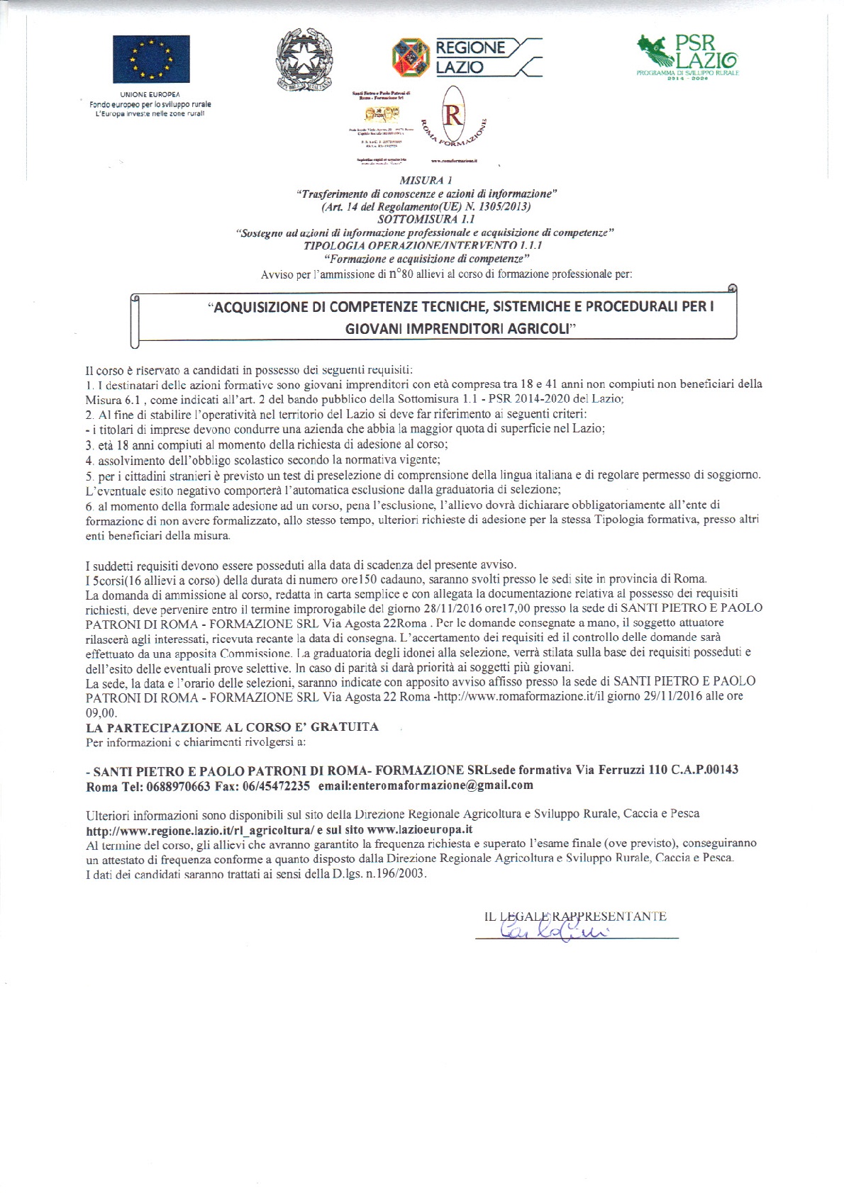 La Santi Pietro e Paolo Patroni di Roma Formazione Srl ha organizzato una serie di corsi per l’aggiornamento professionale in agricoltura nell’ambito delle azioni formative messe in campo dall’Unione Europea con i Piani di Sviluppo Rurale e attuate dalla Regione Lazio. In questi giorni sono aperte le iscrizioni ai cinque corsi, completamente gratuiti, dal titolo “Acquisizione di competenze tecniche, sistemiche e procedurali per giovani imprenditori agricoli”. I destinatari delle misure sono operatori giovani imprenditori del settore agricolo e forestale in età compresa tra i 18 e i 41 anni non compiuti.
