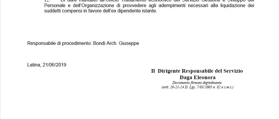 Nel decreto numero 33 del sindaco è scritto che l’architetto Daga è stato scelto previa selezione, conclusasi il 26 giugno, ovvero cinque giorni dopo la firma della determinazione numero 1205 del 2019. Come faceva a sapere che sarebbe diventata dirigente? E’ possibile, e ce lo auguriamo, che l’incongruenza delle date tra l’incarico valevole dal primo luglio e l’atto datato nove giorni prima sine titulo sia frutto di una delle tante bizze del sistema informatico del Comune di Latina.