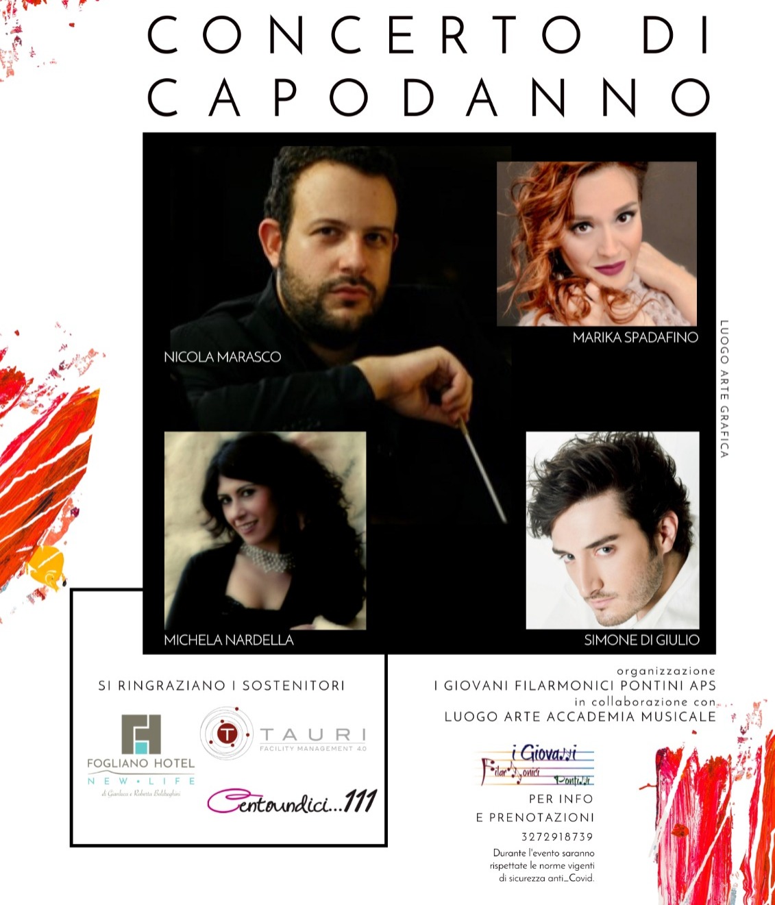 Il Concerto di Capodanno, organizzato dall’Associazione di Promozione Sociale “I Giovani Filarmonici Pontini” con la collaborazione dell’Associazione Luogo Arte Accademia Musicale, vede il patrocinio del Comune e della Provincia di Latina.