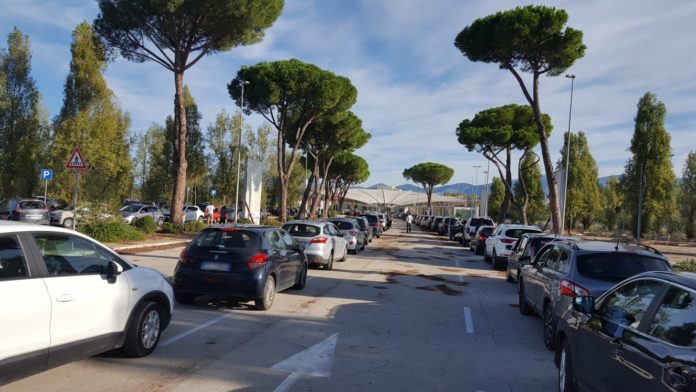 Sono almeno 200 le auto in fila al drive-in per i tamponi dedicato agli studenti della provincia di Latina aperto alla ex Rossi sud.