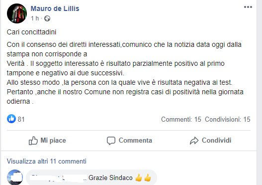 “Cari concittadini – ha scritto De Lillis – con il consenso dei diretti interessati, comunico che la notizia data oggi dalla stampa non corrisponde a Verità. Il soggetto interessato è risultato parzialmente positivo al primo tampone e negativo ai due successivi. Allo stesso modo, la persona con la quale vive è risultata negativa ai test. Pertanto anche il nostro Comune non registra casi di positività nella giornata odierna”.