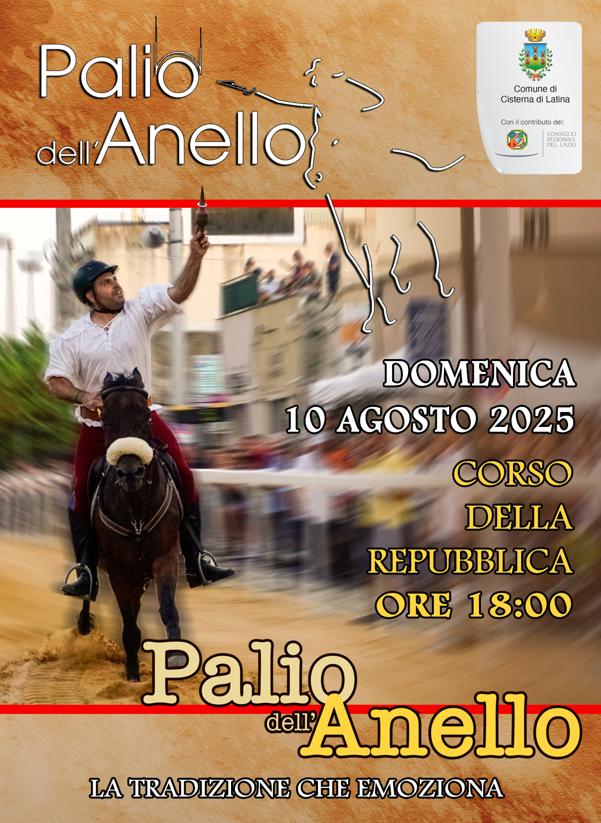 Domenica 10 agosto, alle ore 18.00, nel suggestivo scenario della pista in sabbia allestita nel tratto centrale del Corso della Repubblica, si disputerà l’attesissimo Palio dell’Anello, la storica manifestazione che celebra l’identità cisternese di “Patria dei Butteri”.